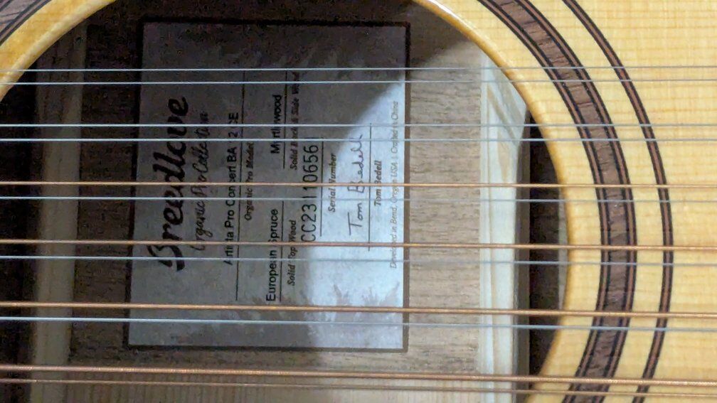Breedlove organic Pro collection 12-string guitar- Artista Pro Concept BA 12 CE. signed by Tom Beddell. solid European spruce top back and sides solid Myrtle wood. comes with Fishman + T pick up and tuner that has controls for treble bass and volume. an onboard tuner.
