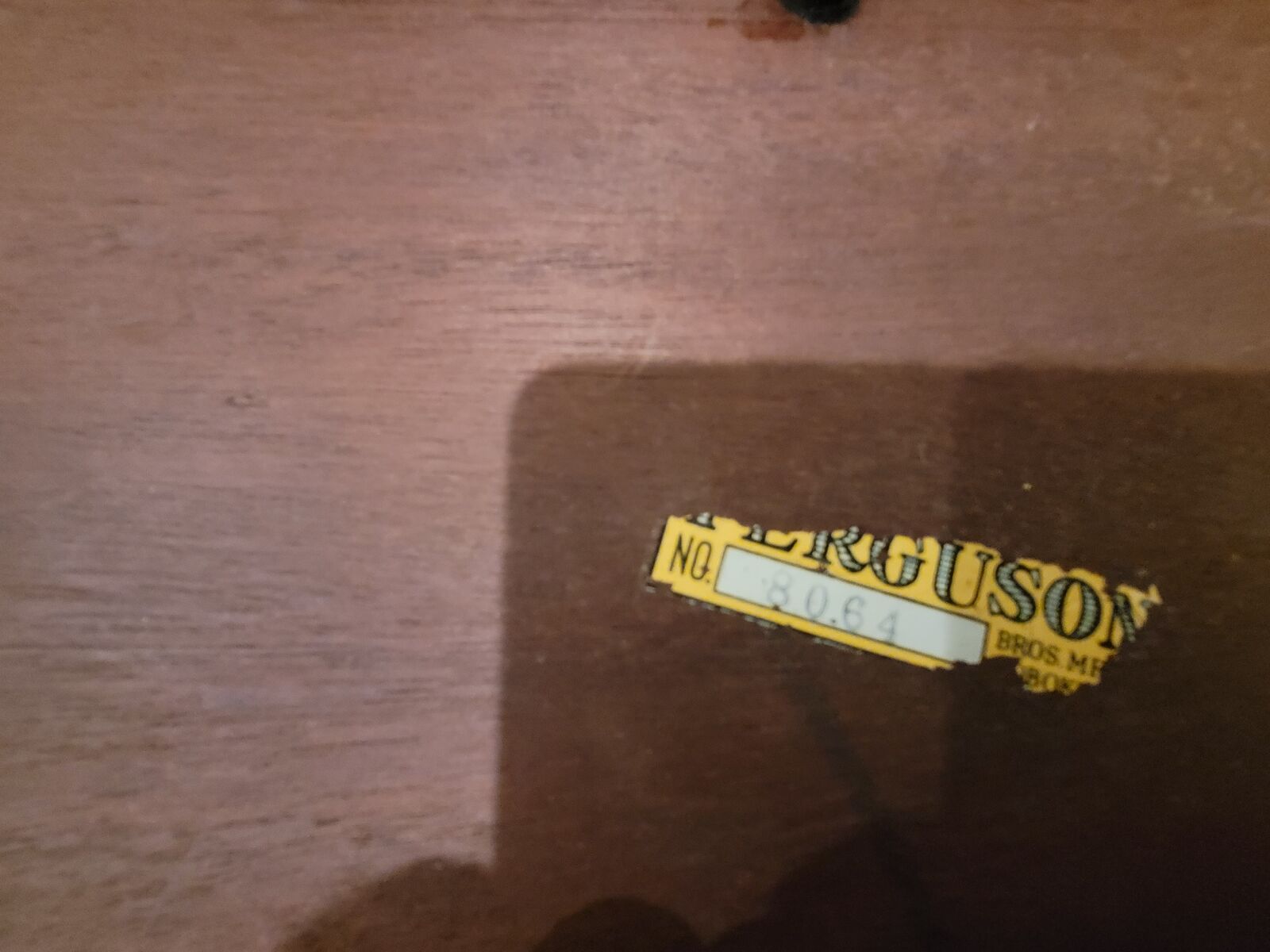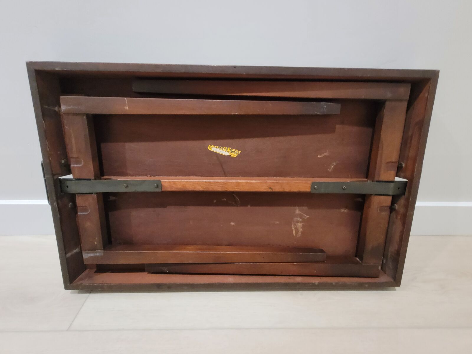 Fox Hunt Decoupage Folding Accent Table made by the Ferguson Bros. Mfg. Company of Hoboken NJ.. This is a solid mahogany folding table that features a decoupage print of a Fox Hunt Scene centered on the table top, a unique folding leg system and metal side handles. It measures 16"deep x 26"wide (not including handles) and stands 19.5" tall when unfolded. I believe it was manufactured between 1925 and 1950.Condition (see pictures):This table is in great vintage condition with a solid construction. It is clean with only light wear and no deep scratches. The legs function perfectly and the decoupage print is clean with on minor stains (see pics). Look at the pictures and judge for yourself, this table is on fantastic shape for its age.Features:⦁ Manufacturer- Ferguson Bros. Mfg. Company of Hoboken NJ.⦁ Type- Vintage Folding Accent Table⦁ Model #- 8064⦁ Material- Mahogany with metal Hardware⦁ Color- Brown with Multi-Color Decoupage Fox Hunt Print⦁ Size- 29 1/2" from handle to handle and 16" wide and 19.5" tall when open.
