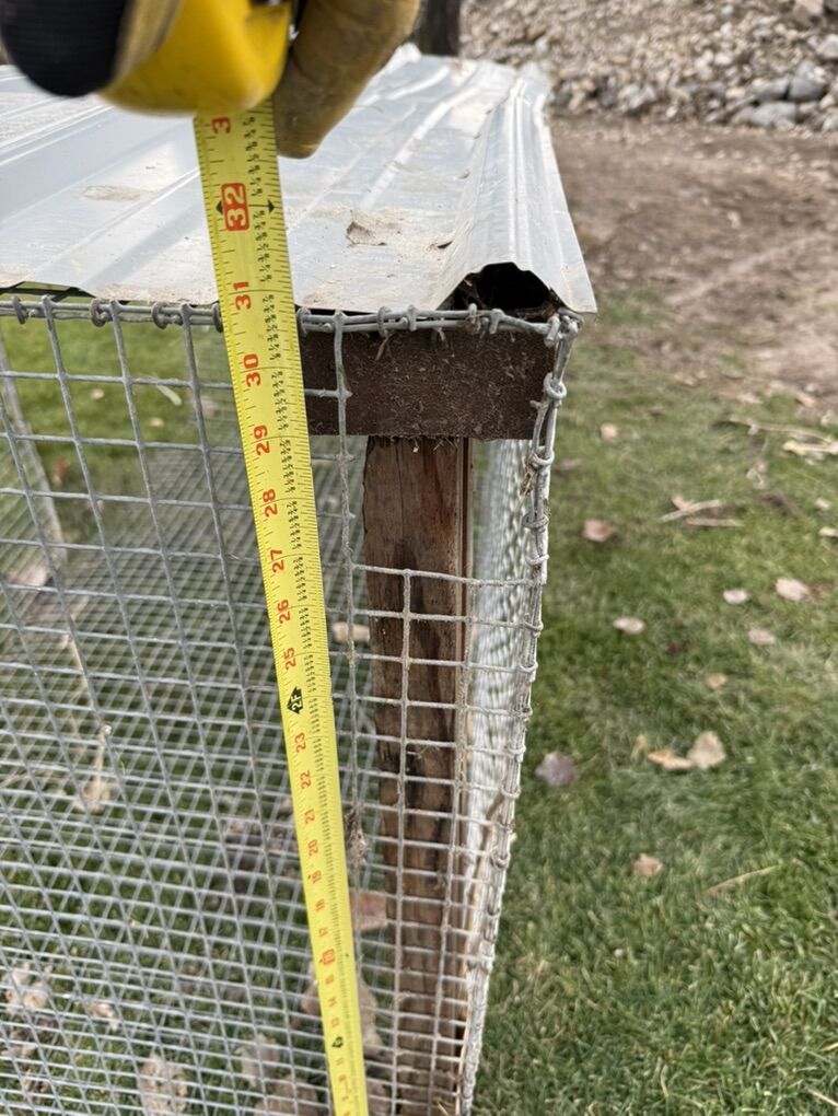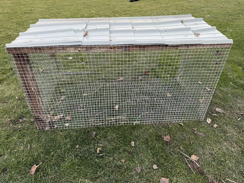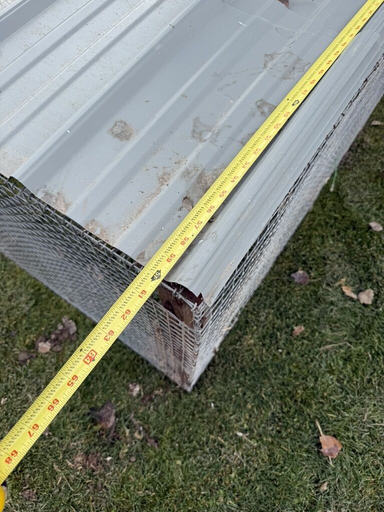 VenmoHeavy wire cage. It’s 5 feet long by 30 in he’s wide by 30 inches tall. It has a large and small door. One for normal access and one for cleaning it out. Roof is scrapped together with some leftover roof steel.