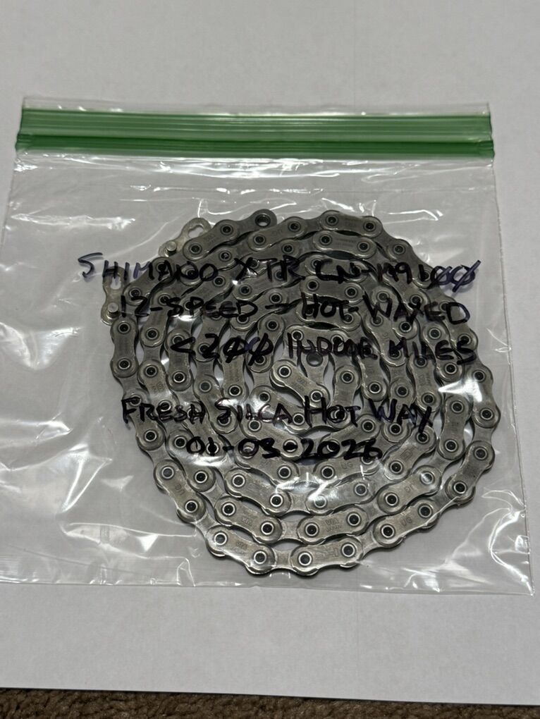 ZelleShimano XTR CN-M9100 (Dura Ace) 12-speed chain (HG+). Originally purchased pre-waxed ($100+ new) from Contender. Under 200 miles on an indoor trainer (i.e. barely broken-in). Never oiled. Never run outdoors. Freshly hot-waxed using a Silca system (second wax). 110 links including quick link. Fully compatible with Shimano 12-speed road (R9200 / R8100 / R7100). $50 firm.