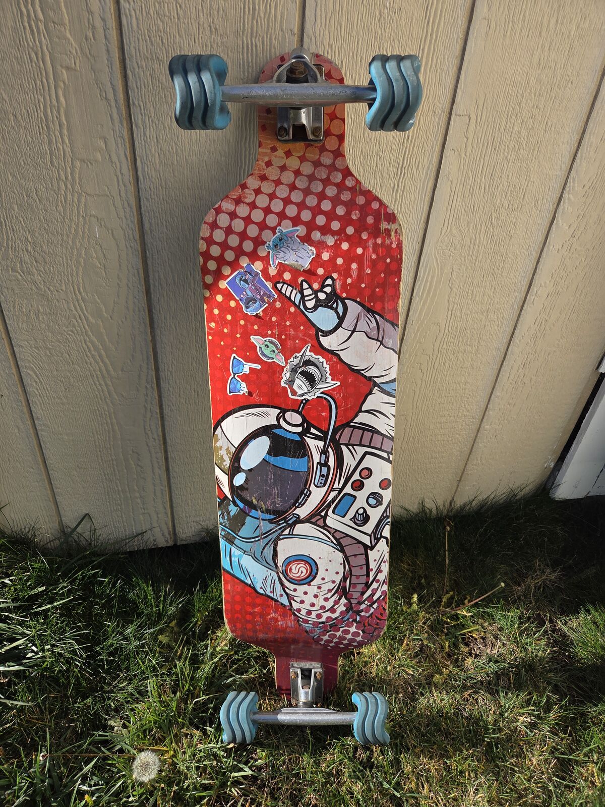 longboard featuring Shark Wheels, known for their unique sine wave shape and performance advantages