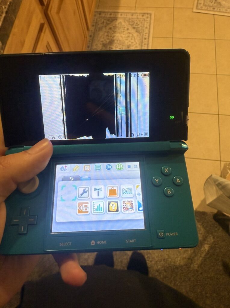 3ds aqua blue- has a cracked top digitizer but still works. Will load up games. Is on an update from~2015. Could be repaired or used for parts- $50
