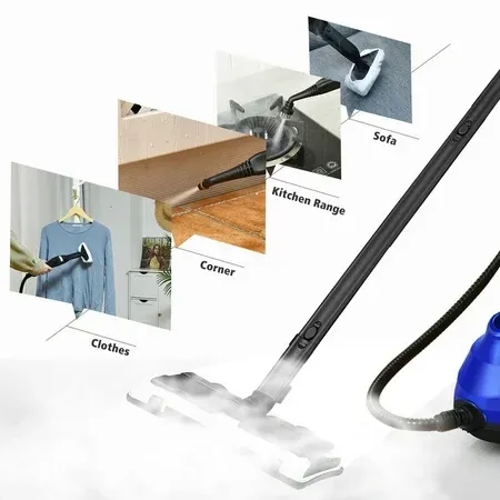 Efficient and Chemical-Free Cleaning: The 2000 W steam cleaner features high steam temperature up to 226°F for deep cleaning and without any harsh chemicals. Besides, the work pressure of the steam up to 4 bar, so it can easily removes all kind of dust in various surface and making the room cleaner. Uninterrupted Cleaning & Large Tank: The steam cleaner need pre-heating 5 to 6 minutes before using . And with 1.5 L water tank, the steam cleaner can work for 30 to 45 minutes according to steam rate. Besides the red LED will light when there is water shortage. Additionally, it comes with an uninterrupted steam release function for easy using without trigger the steam all the time. Automatic Power Off & Child safety Lock: The steam cleaner with built in child safety lock which is designed to protect children or pets from accidental injury. Besides, with a high sensitivity temperature control system, the steam cleaner will auto cut-off when overheating for safety of users and machine. The green light indicates a pressure of up to 8.8lbs. 19 Versatile Accessories Included: The steam cleaner includes 19 different accessories such as glove, measuring cup, two ex tension tubes, ironing brush, glass brushing for performing cleaning activity as per requirements. It can perfectly clean different surface and widely used in cars, offices and homes. Considerate and Convenient Design: Features flex ible wheels, the steam cleaner is very easy to maneuver and lift. An ex tra-long 10ft power cord and 2 ex tension tubes increase mobility and keep everything within reach while cleaning. And the cord reel and the small accessories storage device keep everything in order.