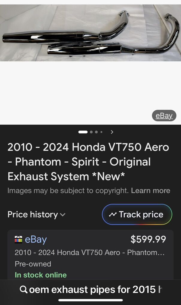 VenmoI have this never used set of exhaust pipes, saddle bag brackets and chrome oil filter for a Honda Shadow Aero VT 750. They were on the bike in the photo below. They were taken off to install Vance & Hines exhaust. Brand new. Compare to the $600 price listed below, Cash only, Located 5 miles east of Kanab Utah on 89. Thank you