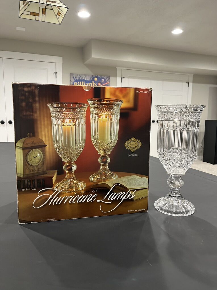 VenmoUp for sale is a pair of Shannon Crystal Hurricane Lamps by Godinger, each approximately 14 inches tall. These are in excellent gently used condition, crystal is clear with no chips, cracks, or cloudiness. Perfect for mantels, dining or entryway décor.