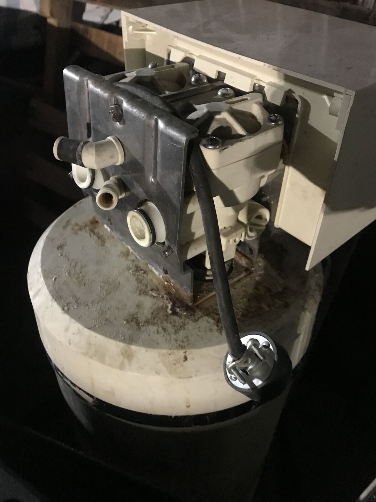 COMPRESSER / RECHARGER AND SALT SILO WITH ABOUT 50 POUNDS OF SALT STILL IN IT