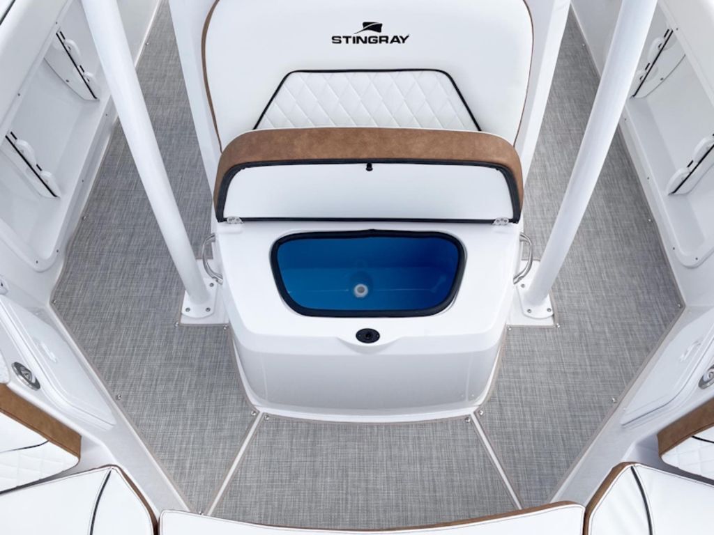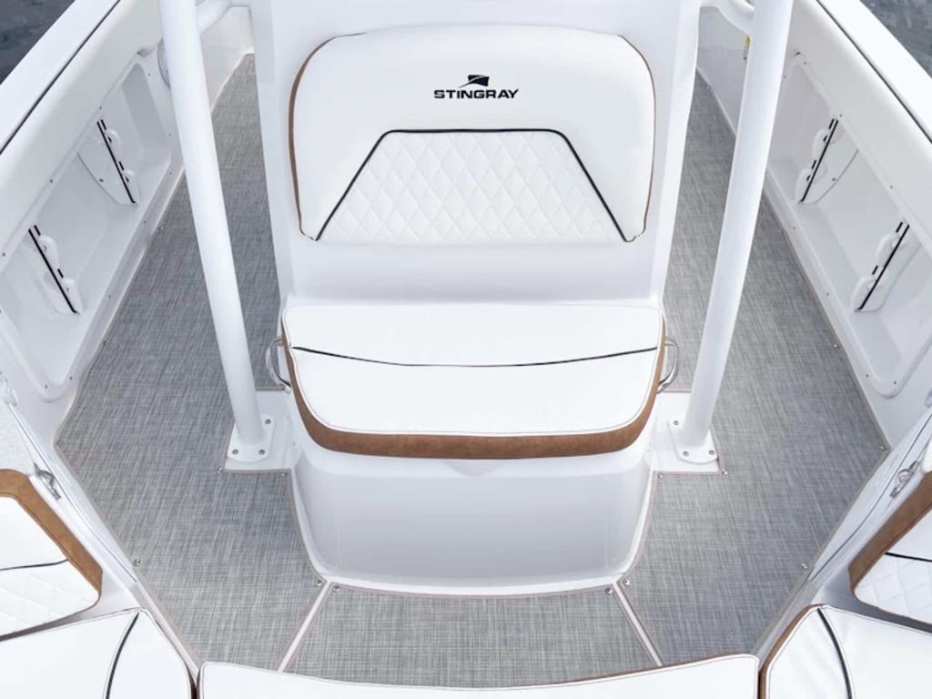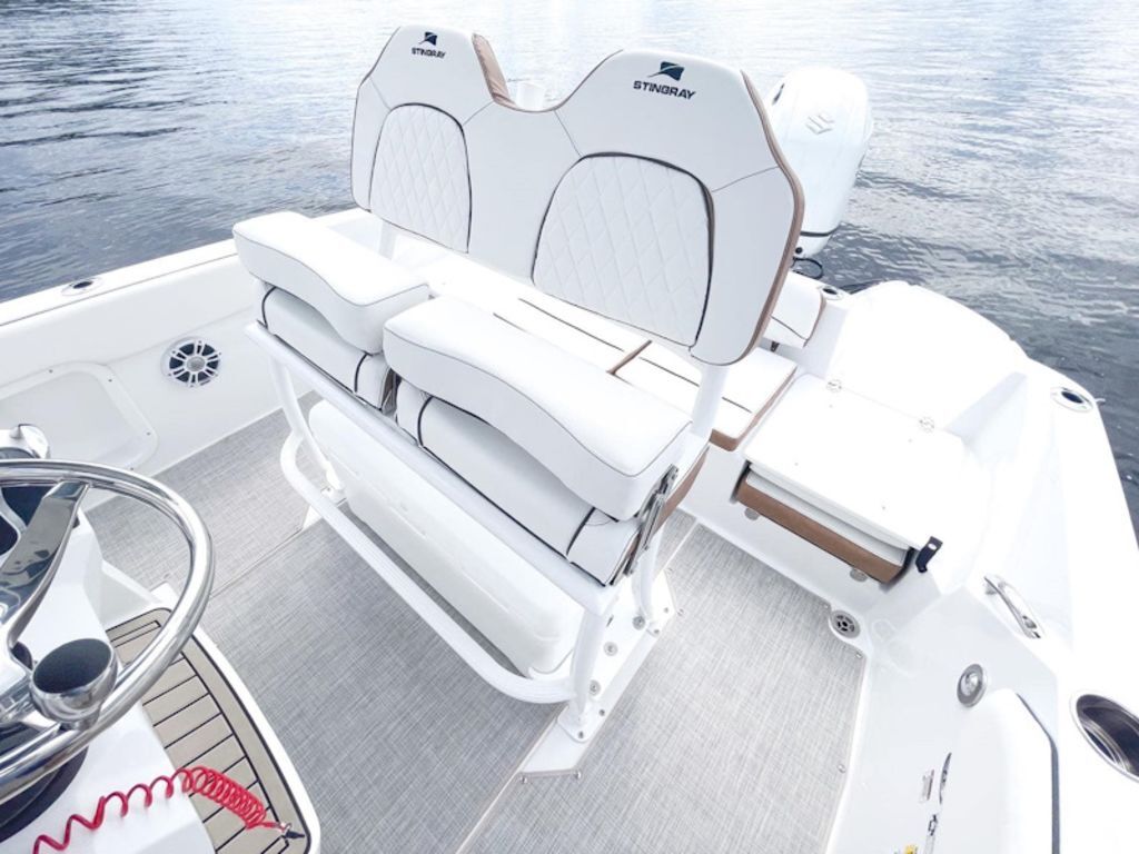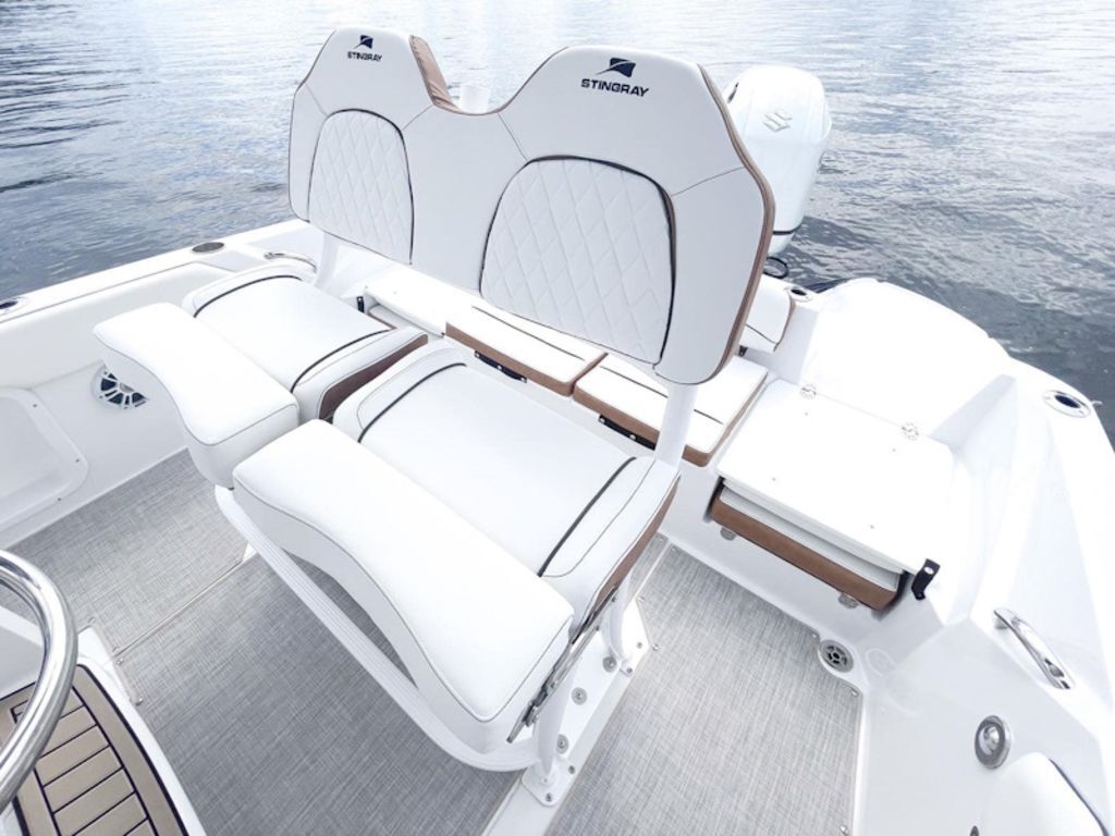 For a day out with the family, it offers lots of space for maneuvering about, plus seating for nine passengers. To ensure that none of the deck area is cluttered when headed out for a day on the water, STINGRAY designers effectively made use of all the space on board to incorporate lots of storage areas around the boat. Beneath the helm is a large area that can be used as a changing compartment and also upgraded to a head compartment. The two rear flip-down seats make it easy for your passengers to enter and exit the boat from either port or starboard.