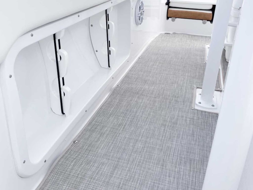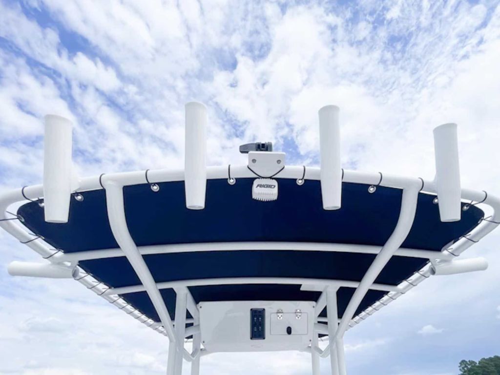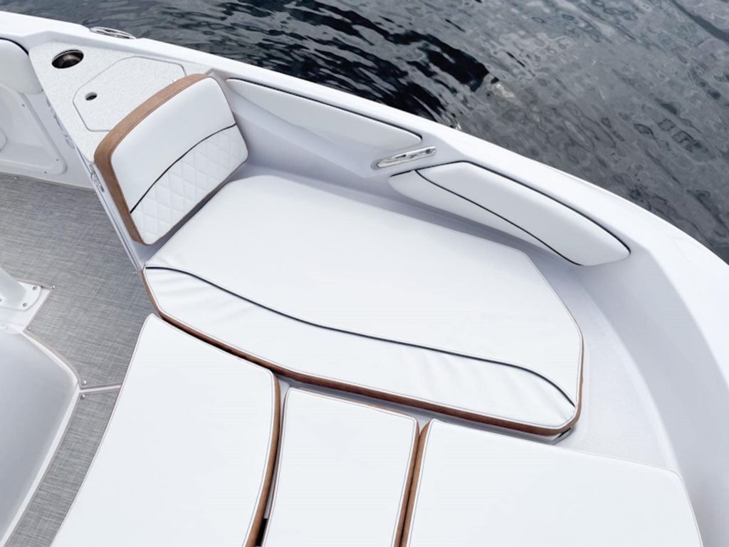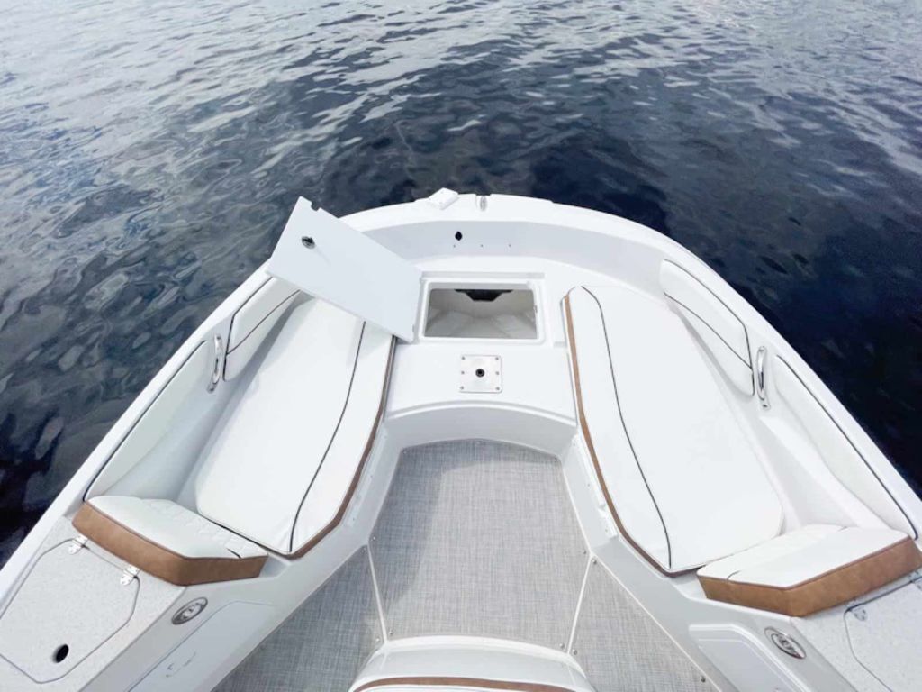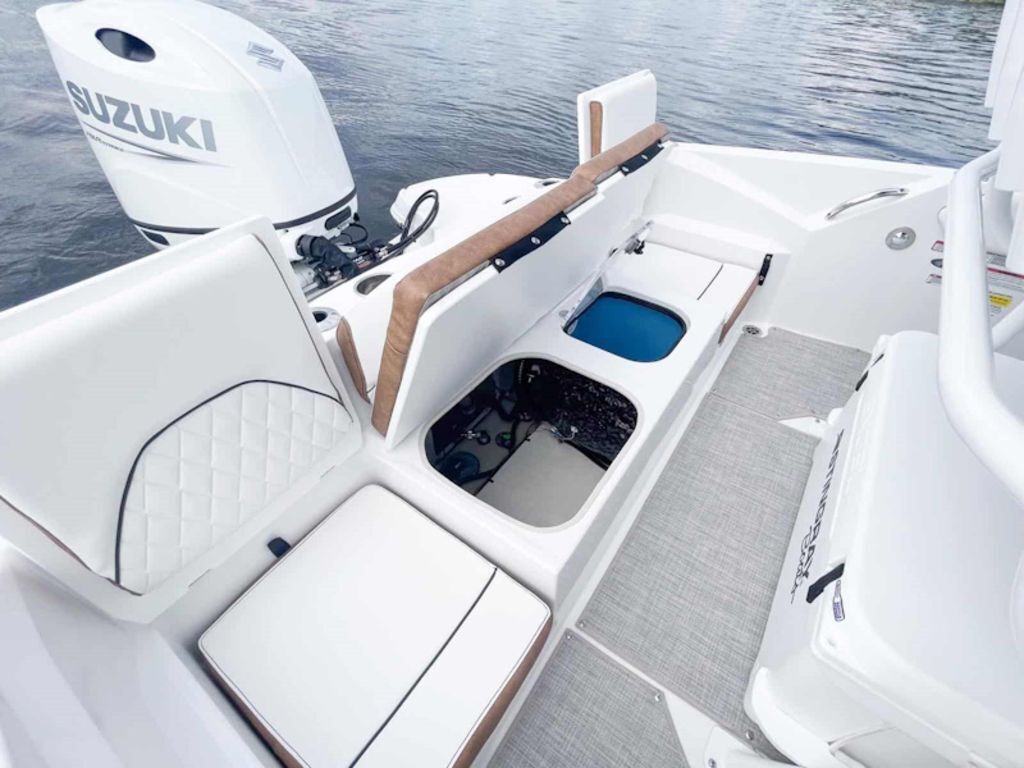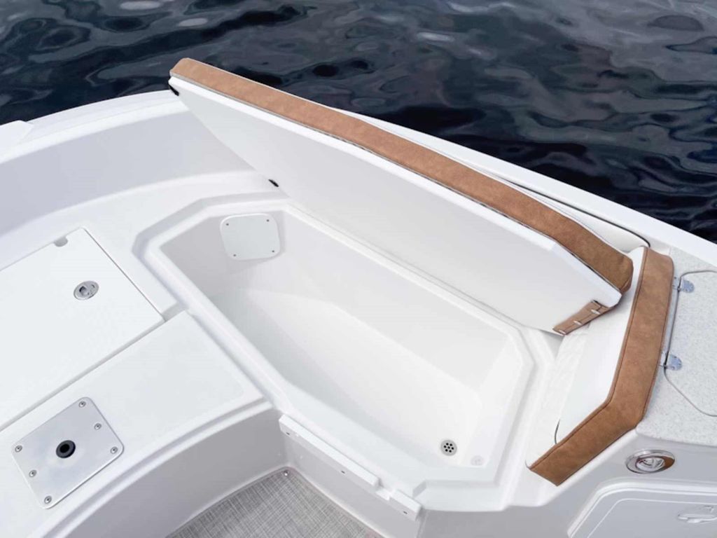 For the anglers, a low profile design makes it easy to navigate in low clearance areas, a helm seat for two has an adjustable seat / leaning post for fishing, a clean dash design leaves room for GARMIN electronics, the main helm seat lifts to reveal a conveniently located 26-gallon live well, and the forward bench offers an 18-gallon cooler that can be upgraded to a live well. The walk-around access, combined with the large foredeck, makes it easy for anglers to quickly move around the boat. Additionally, two rear seats lift up for seating and quickly fold down for use as casting platforms. Fishing rods are easily accessible thanks to abundant rod storage on both sides of the boat.