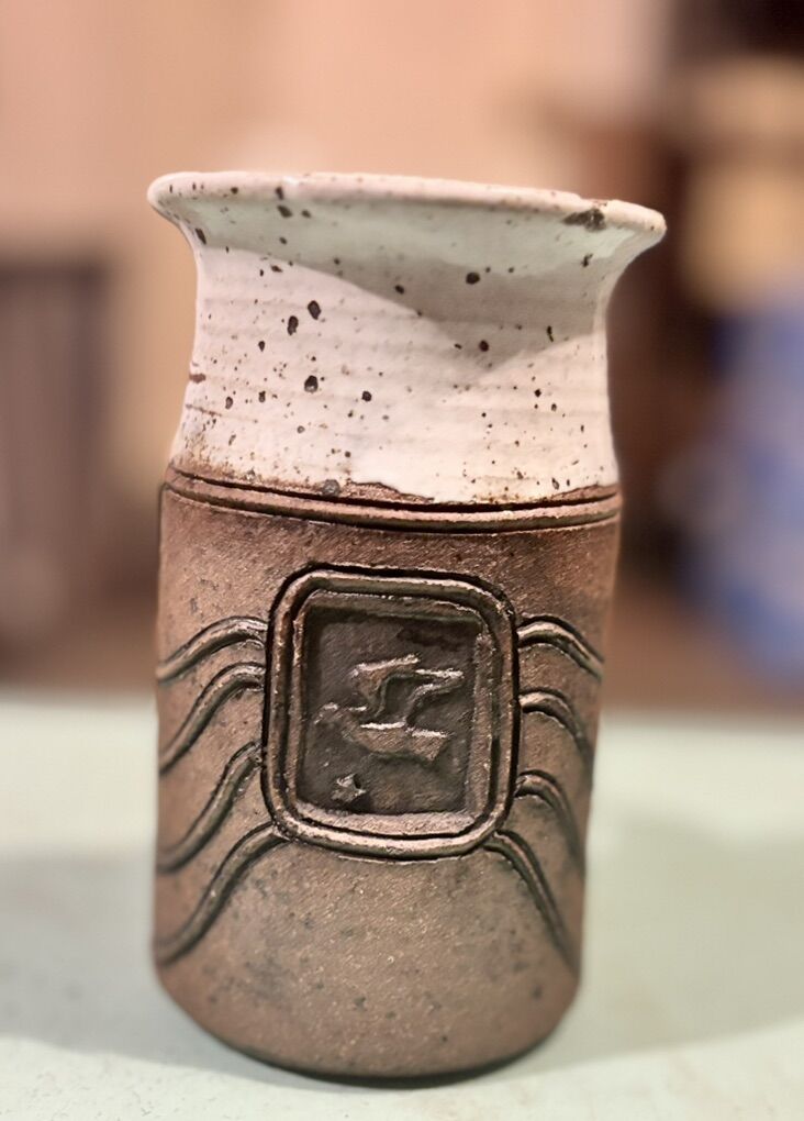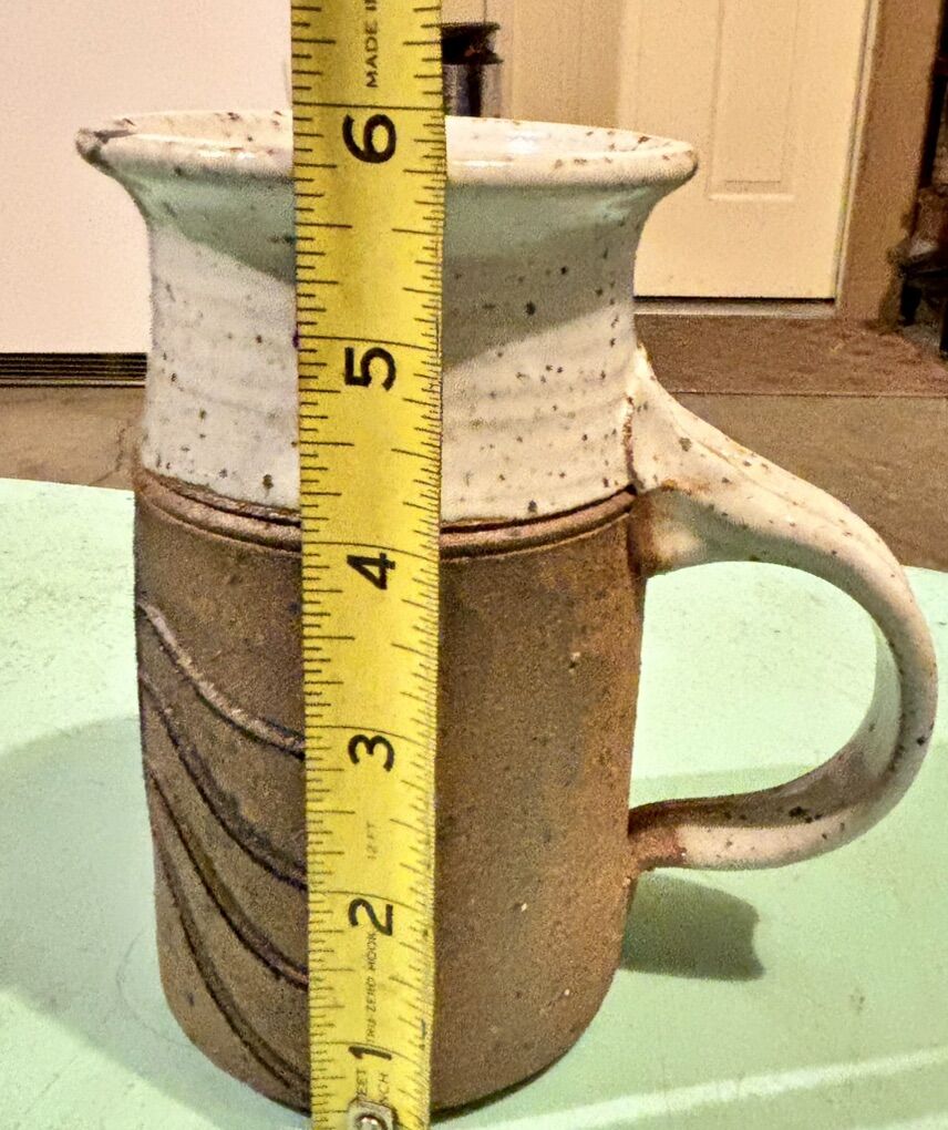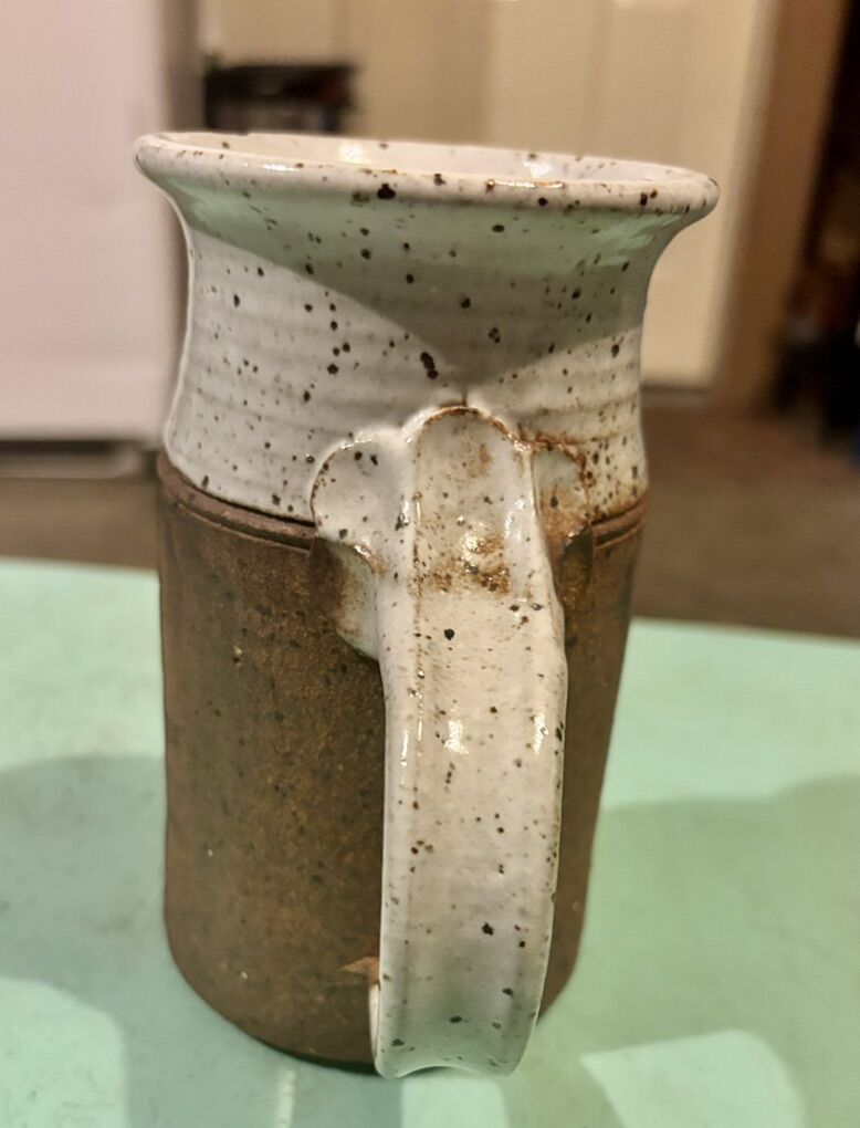 Handcrafted vintage studio pottery in warm earth tones. Brown textured body with a white speckled rim and simple incised design. Solid, well-made piece with a great rustic look.