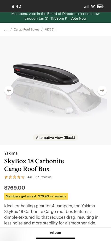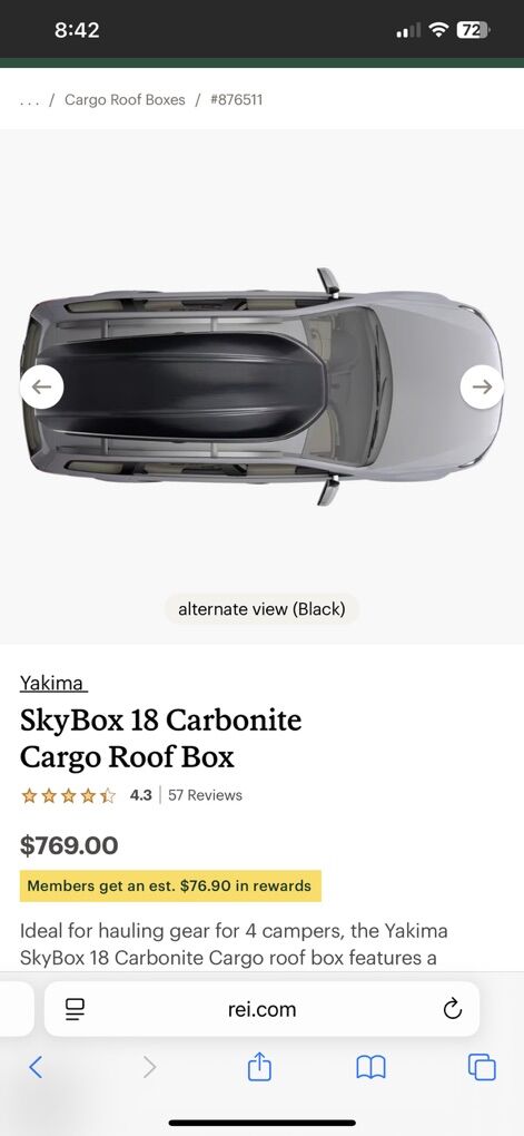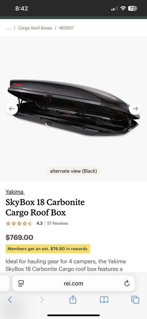 VenmoIdeal for hauling gear for 4 campers, the Yakima SkyBox 18 Carbonite Cargo roof box features a dimple-textured lid that reduces drag, resulting in less noise and more stability for a smoother ride.