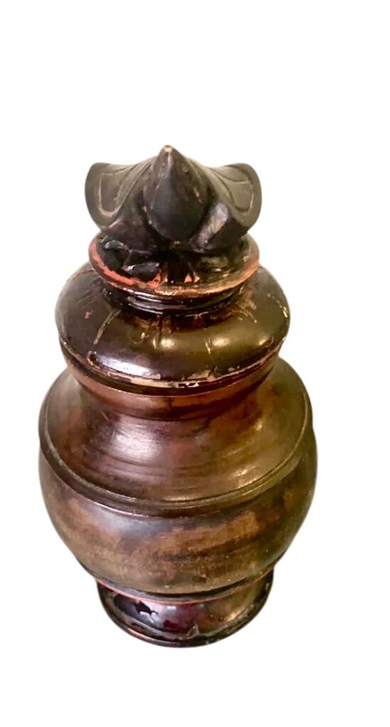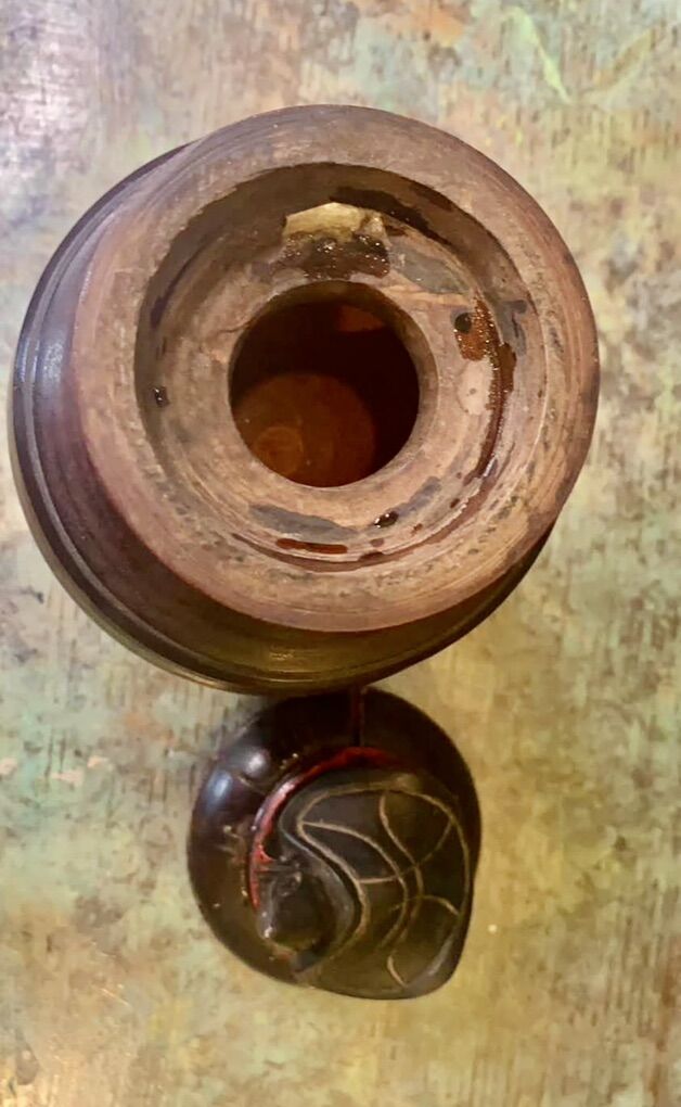turned treen bulbous form container. stands approximately 8” tall.It retains the original finish along with carved turtle lid.
