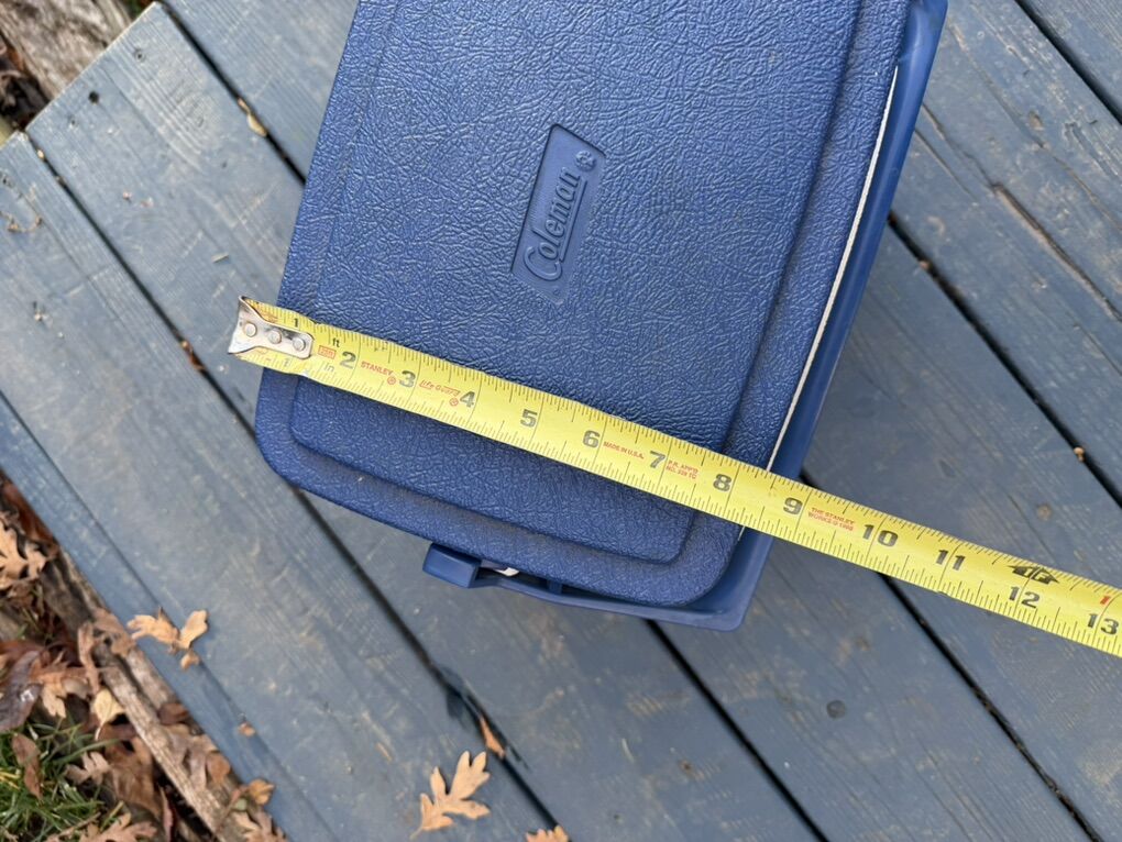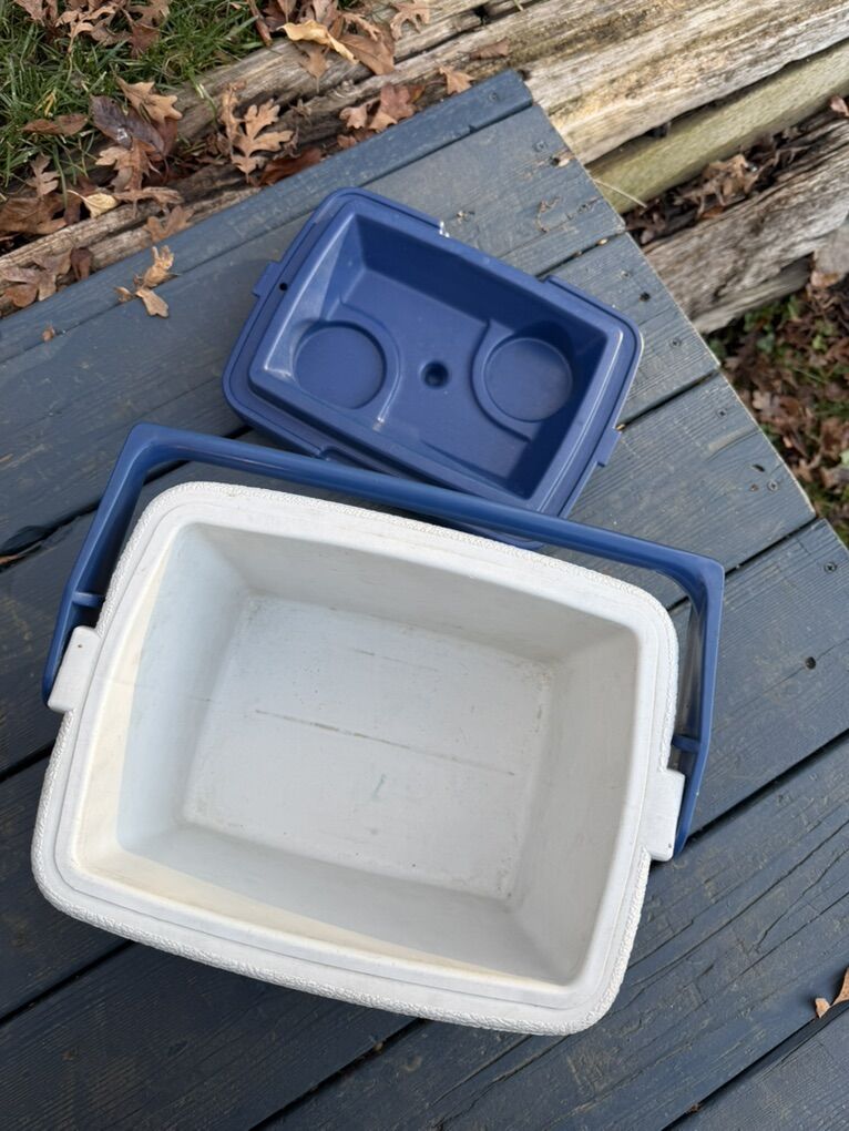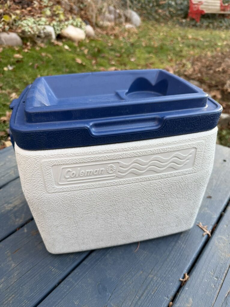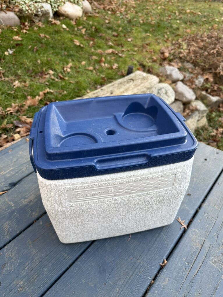 Compact, durable Coleman cooler in good condition. Hard-sided design keeps items cold and protects contents. Built-in carry handle and molded cup holders on the lid make it easy to use for picnics, camping, beach days, or kids’ sports. Lid is reversible for cup holders or smooth top. Handle locks lid in place for secure transport.