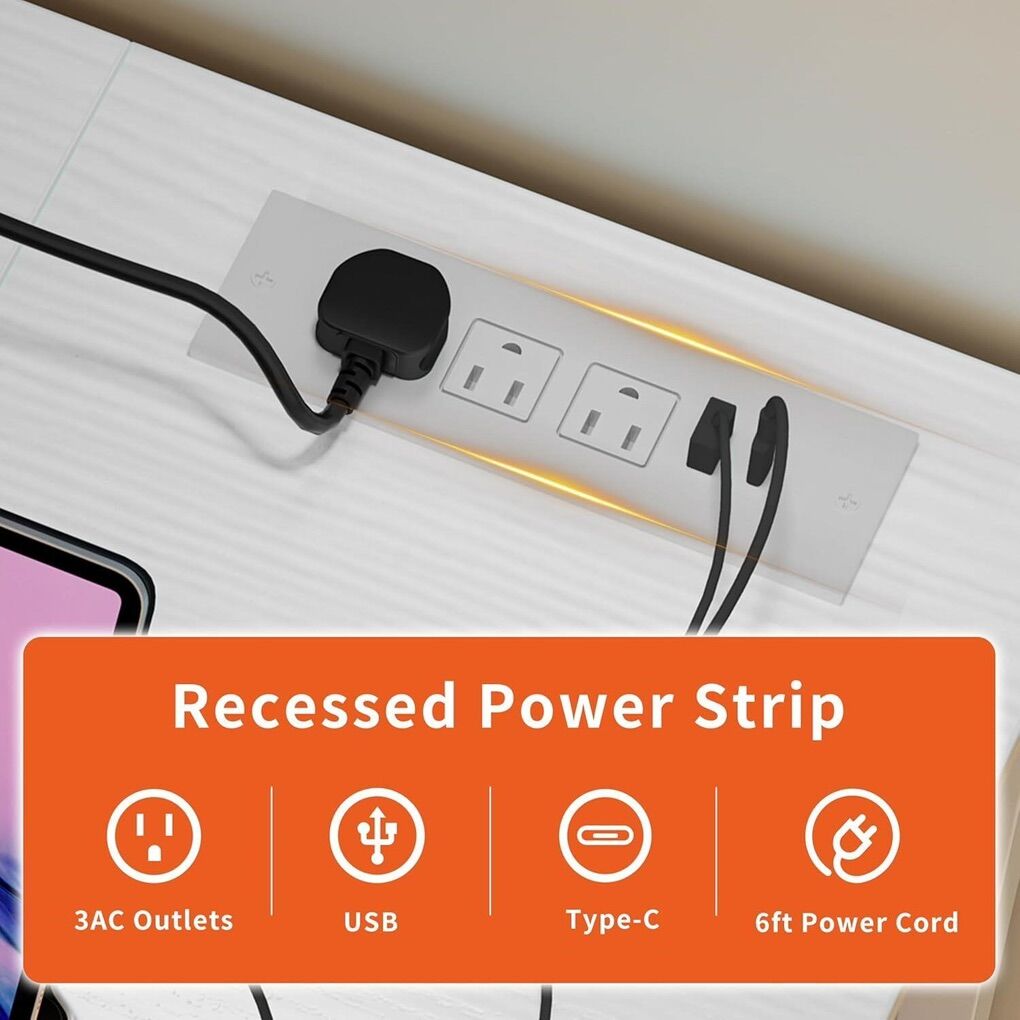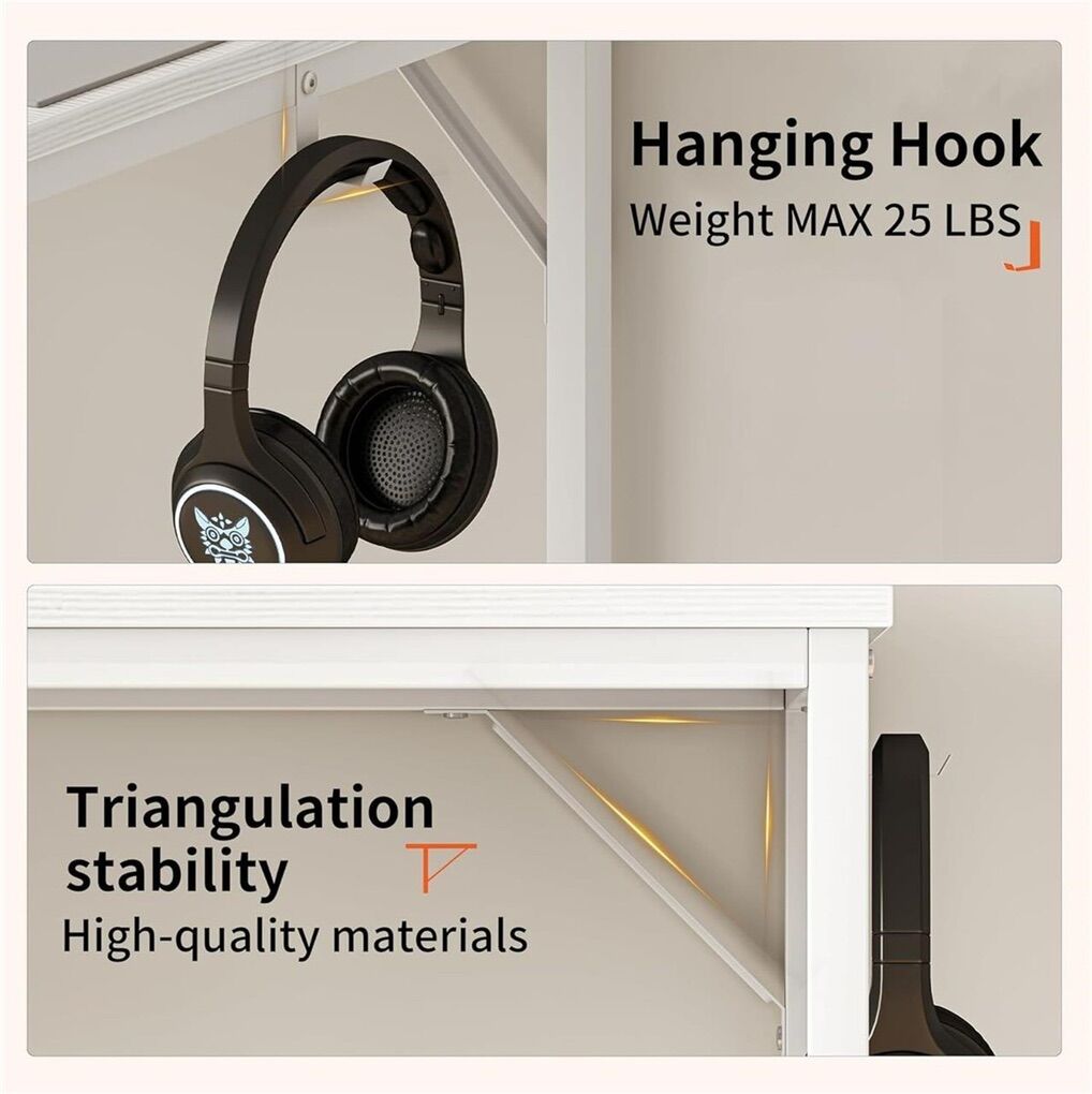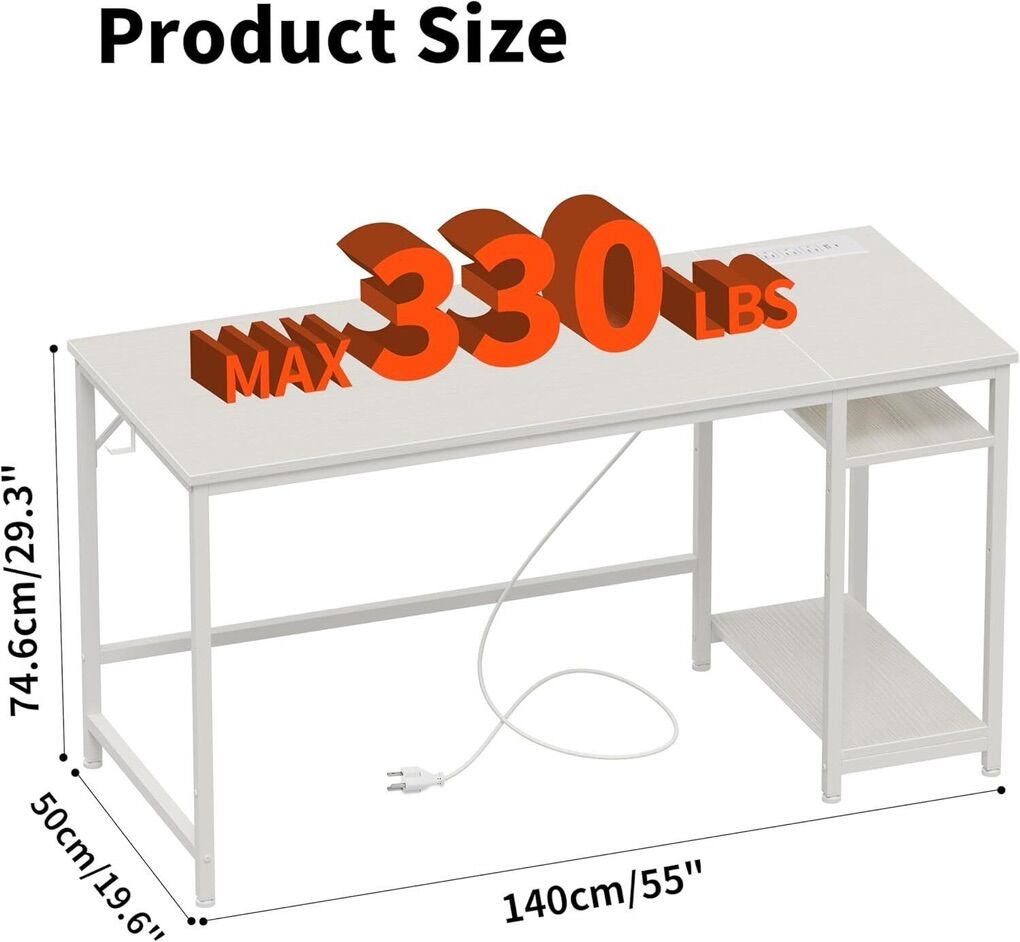 USB and Type-C This computer desk is equipped with 3 power outlets, 1 USB, and 1 Type-C charging port, which can easily charge your electronic devices. Reversible Storage Cabinet The office desk comes with double-sided storage cabinets, which can be placed on the left or right side as needed. The storage shelves are adjustable to different sizes, which can put down the computer mainframe, books and so on. Stable & Sturdy The desk is made of thicker and thickened carbon steel square tubes, also equipped with 2 diagonal supports to support the structure of the table body stable and not shaking, load-bearing up to 330 pounds. The desktop is made of E0 grade particle board and good coating material, scratch and waterproof. Adjustable Feet Adjustable feet keep the computer desk with storage stable on slightly uneven floors and protect the floor from scratches. You will no longer be disturbed by annoying wobbles while working or studying. Easy to Assemble Comes with detailed multi-language instructions and clearly labeled parts, allowing you to assemble this study desk with storage quickly and easily.