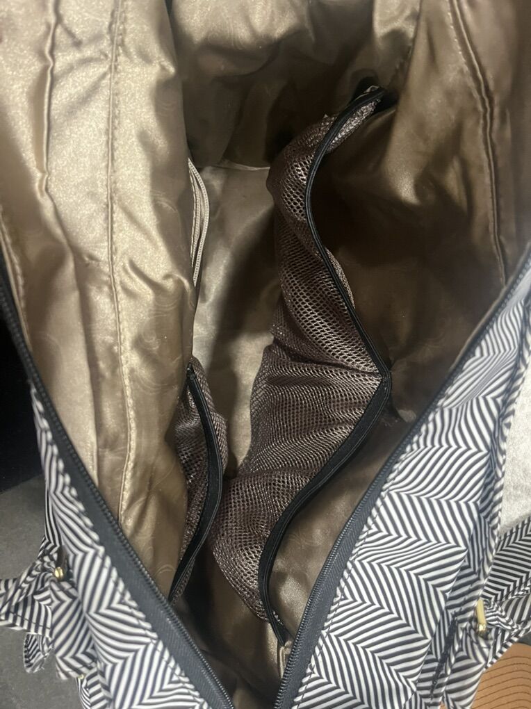 GooglePayBlack and white Jujube diaper bag in great condition. Has one main pocket with four smaller pockets inside it. Has two back pockets, one for a changing pad (not included) and another small one. Has two side zipper pockets. Has one front pocket with three smaller pockets, a bottle holder, and a pacifier clip inside.