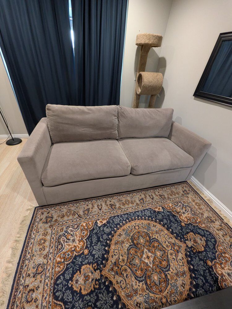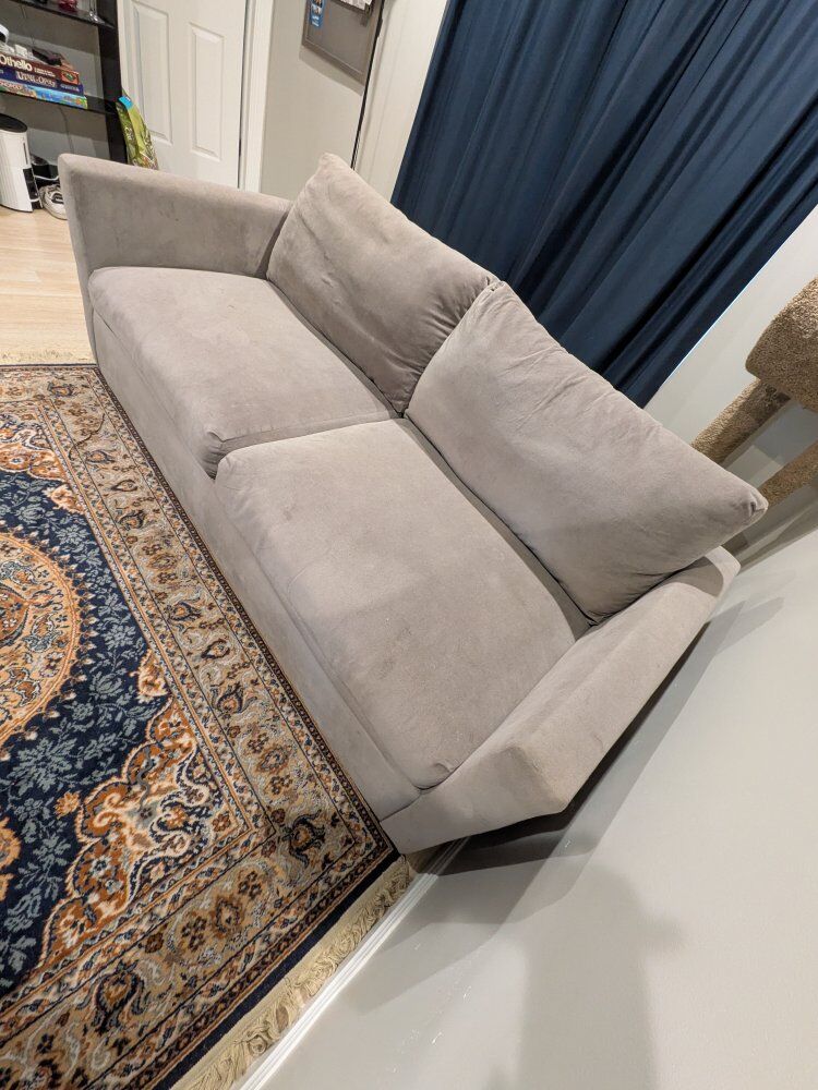 CashAppThis comfy grey couch is in good shape! There are no rips or holes in the fabric. The cushion covers are all removable so you can take them off and wash them. It's a used couch, so it does show some wear and it is pretty sunken in, but it honestly makes it more comfy.