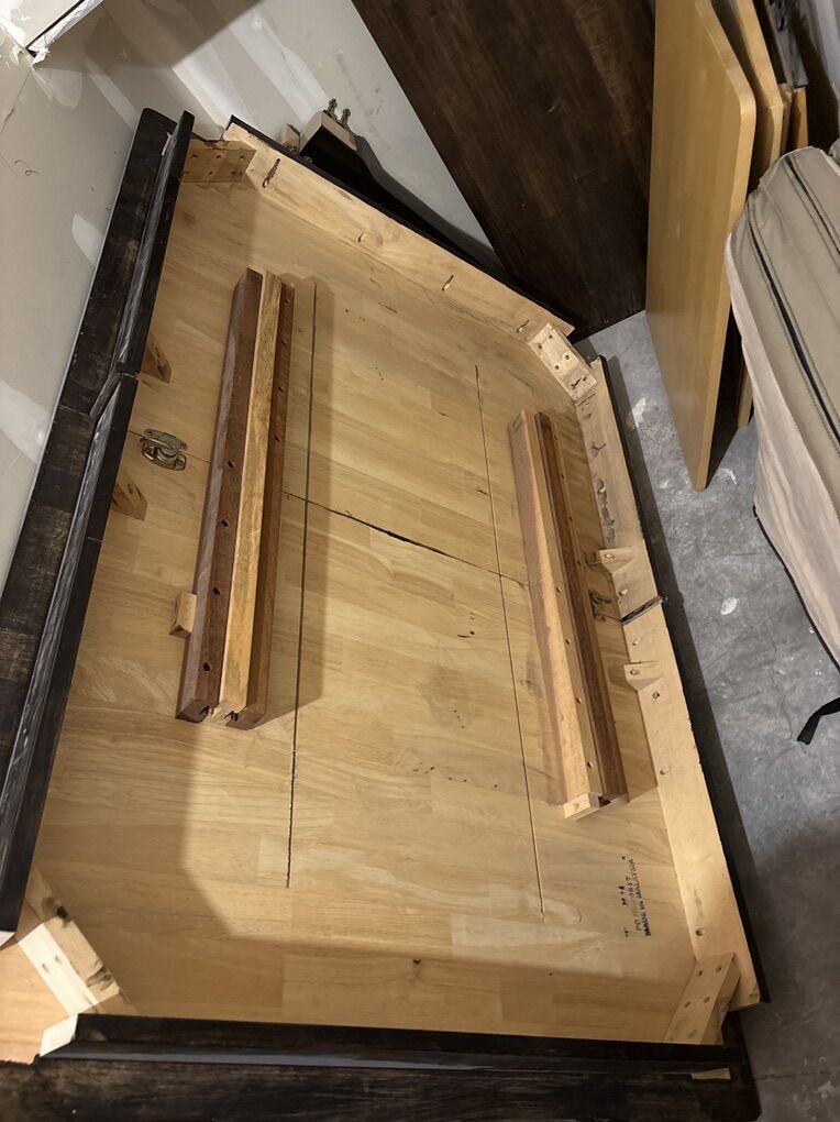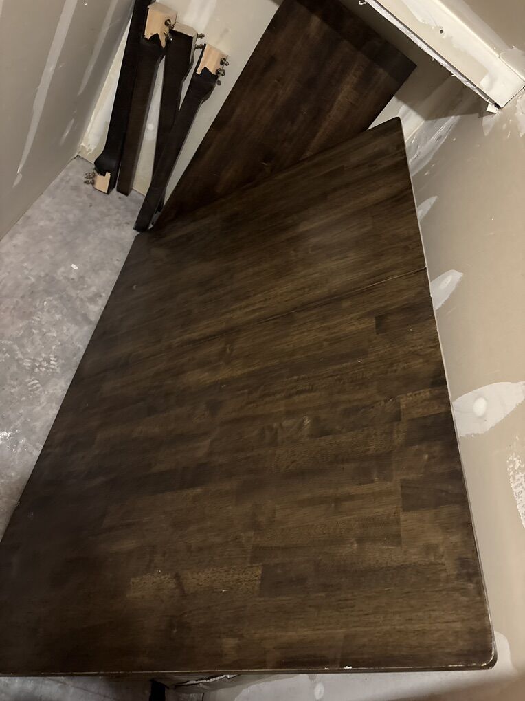 It has a dark stain finish that can be sanded and redone to your liking. L 60 in with 18 in extension W 42.5 H 28.5 in to base of tabletop. The top is 1 in Also has six matching chairs $100 dollars each.