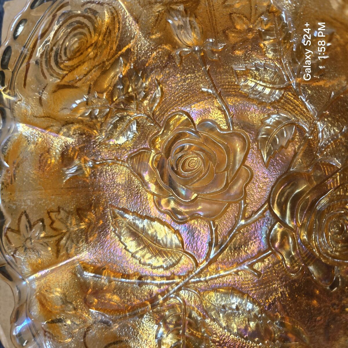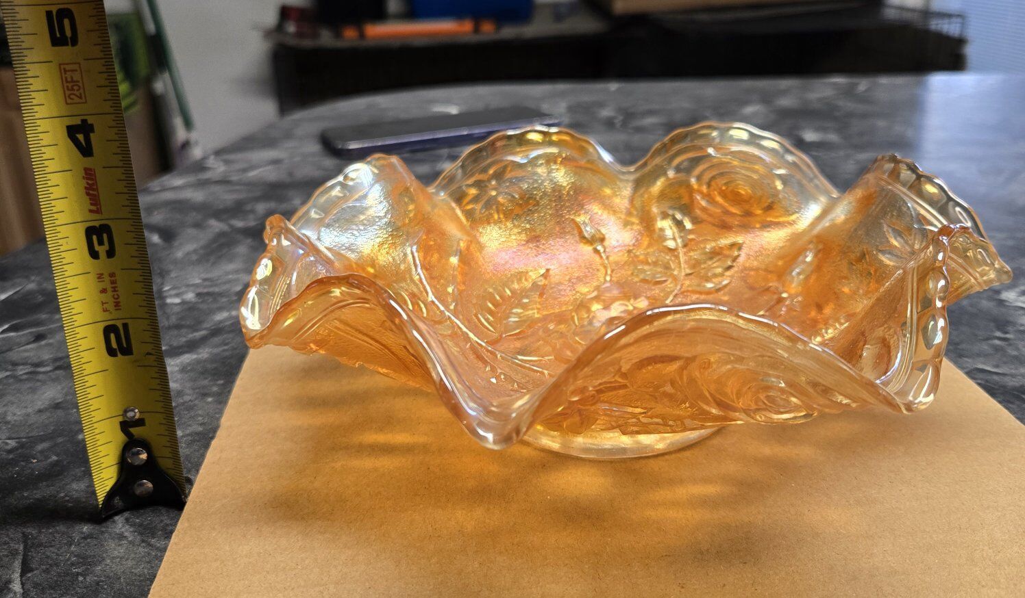 This is a Vintage Imperial Carnival Glass Open Rose 8.6 inch Ruffle Edge Bowl. NO chips or cracks. Picked up in Taylorsville. Thank you.