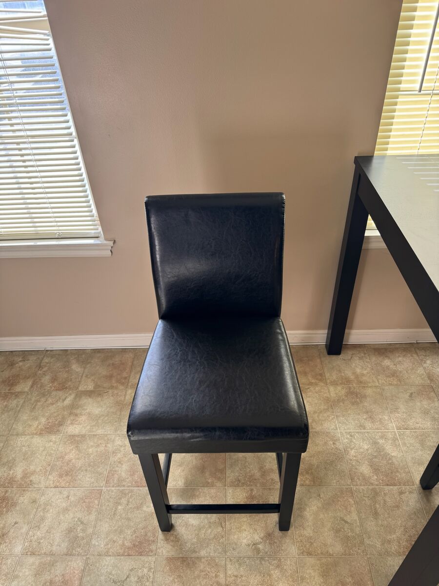Set of 4 black, counter height dining chairs. They have a wooden frame and leather covered seats.