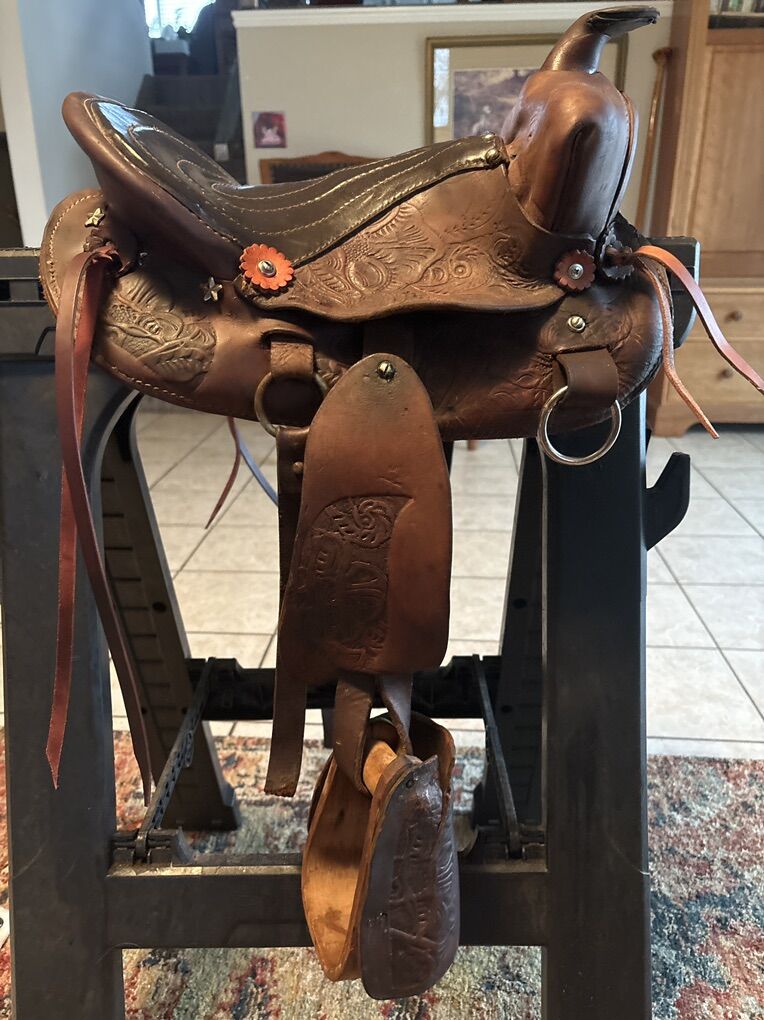 12 inch kid saddle. New strings and recently cleaned and conditioned. Located 7 miles south of Logan. 150.00
