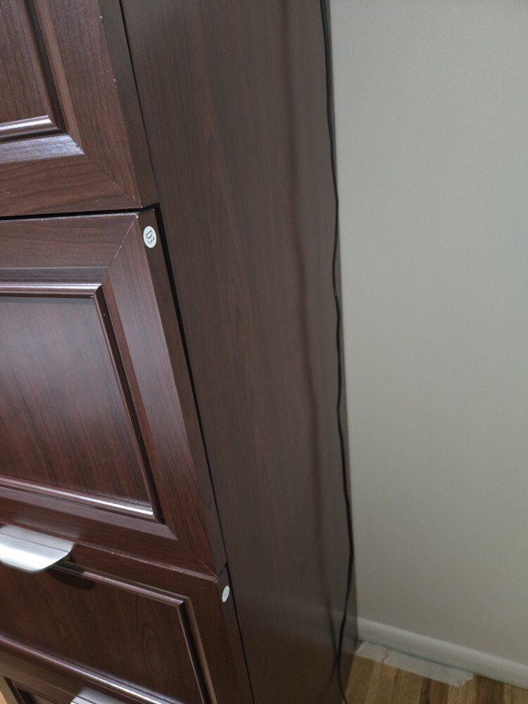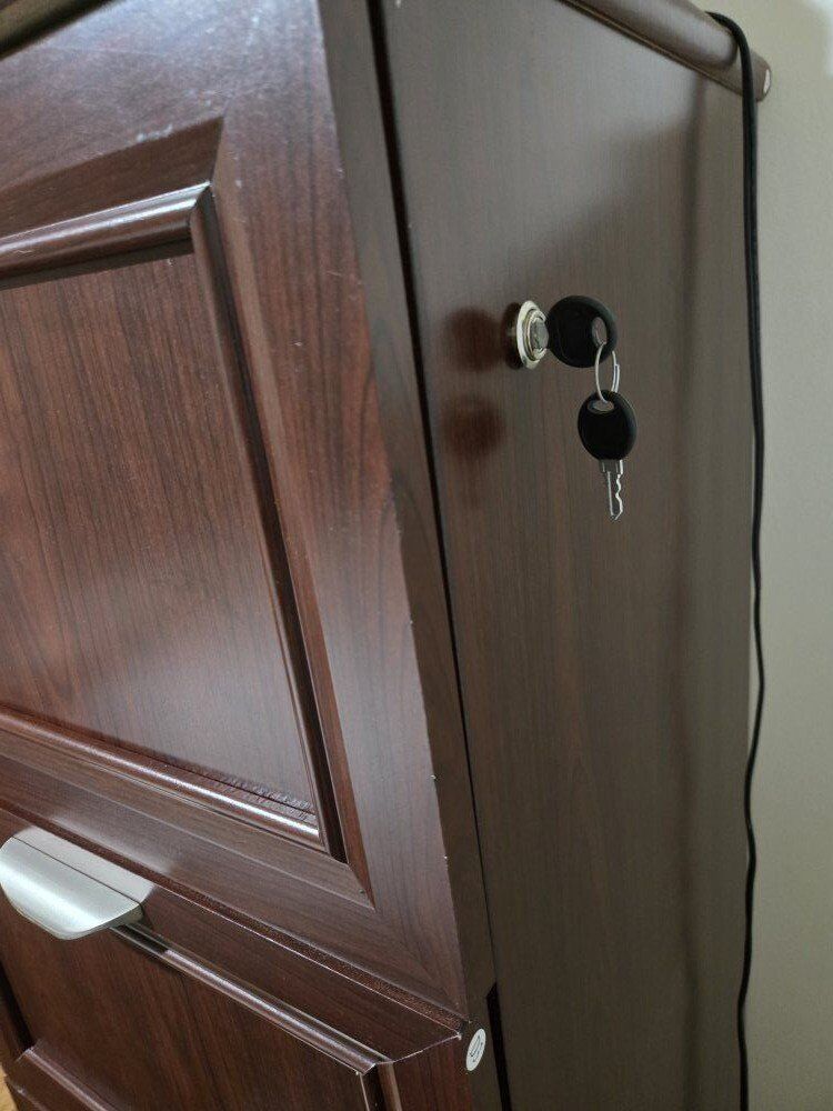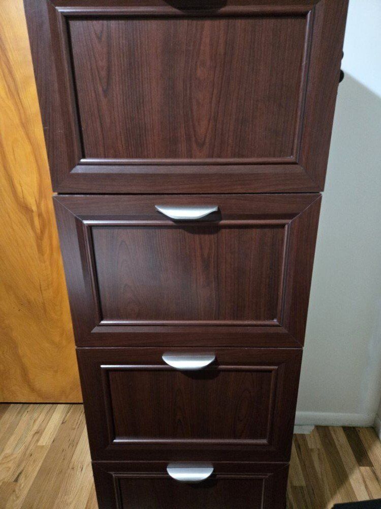 Venmoobo manufactured wood. 4 drawers. top drawer locks with 2 keys. you'll need 2 people to move it or a dolly