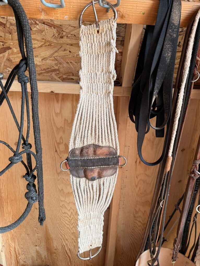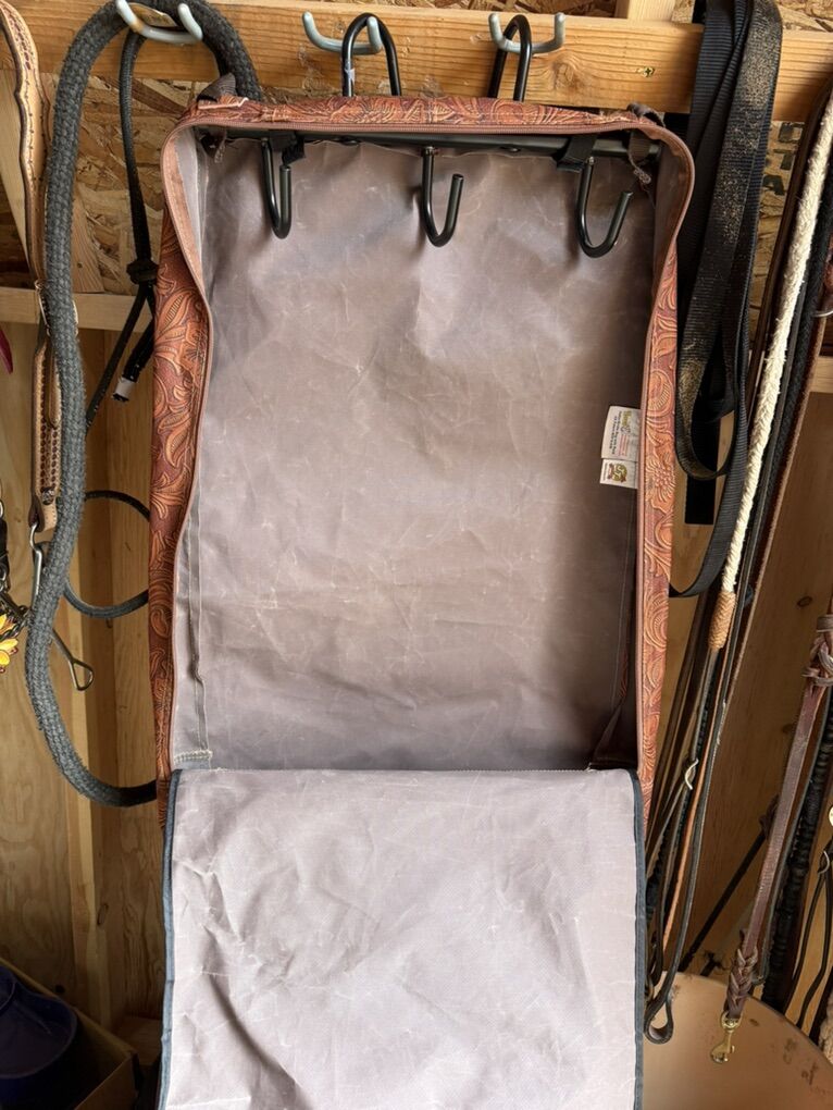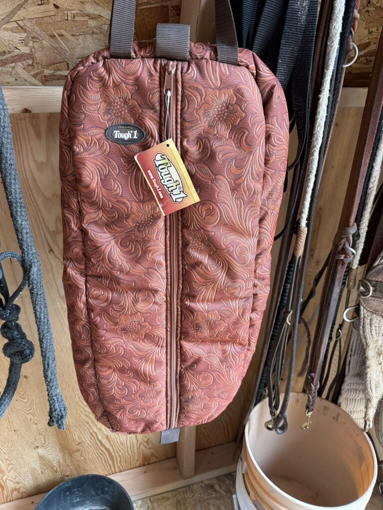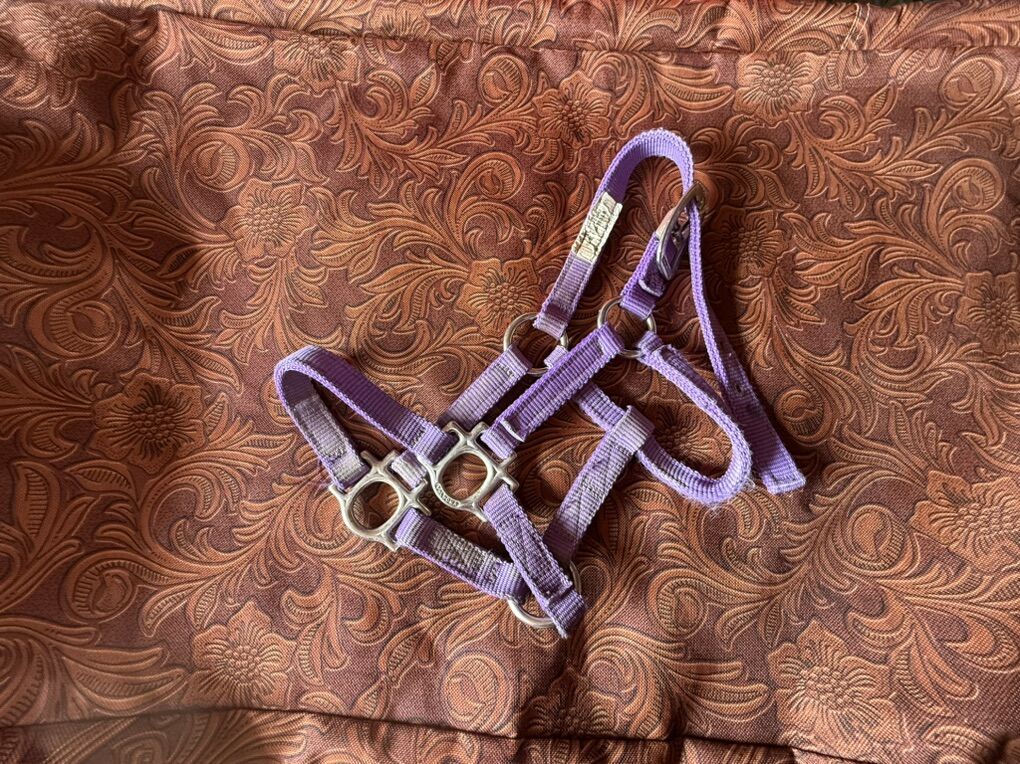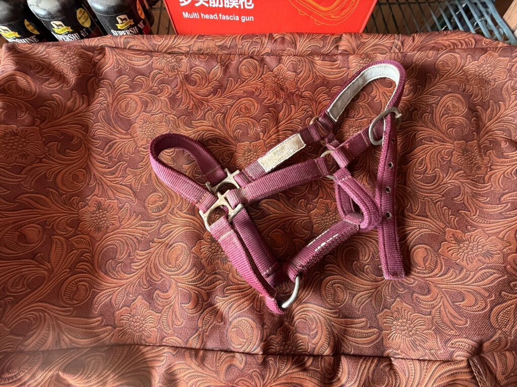Bridal bag with hooks - $35 Bridal bag w/o hooks - $25 Rope halter - $5 Purple halter, pony - $5 Maroon halter, small horse - $5 Black halter, large horse - $10 Pony tie down - $5 Horse tie down - $15 Horse bit - $8 Pony bit - $5 Bit guards - $5 per set Breakaway kit - $10 Cinch - $10 Saddle Blanket - $10 Tail wrap - $8