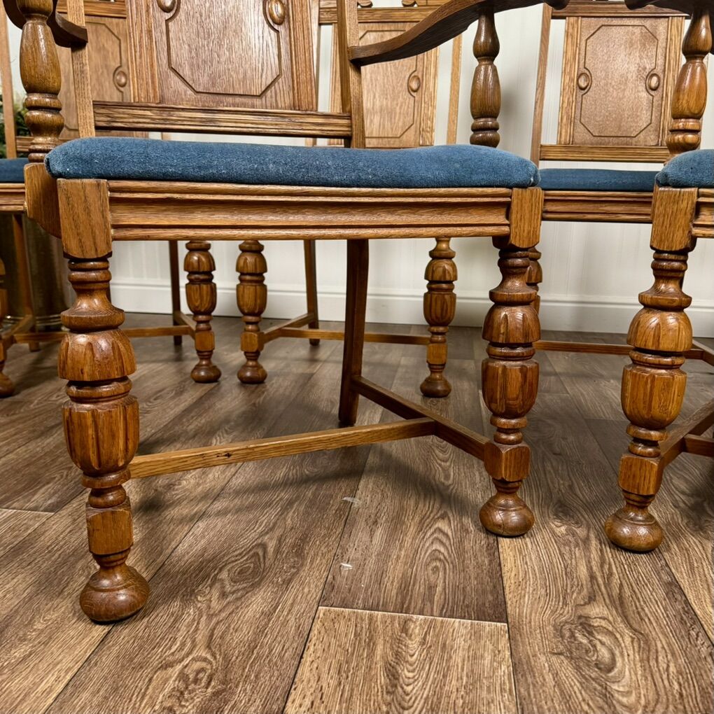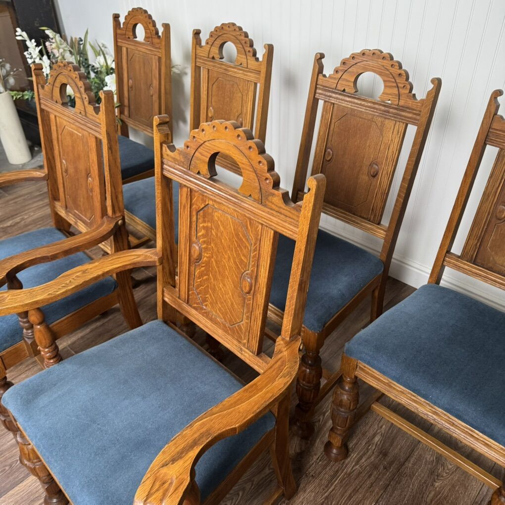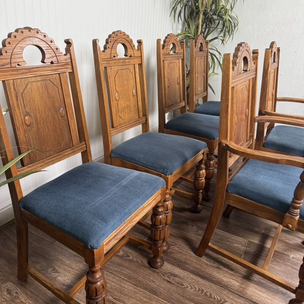 VenmoElegant set of six antique solid oak dining chairs, including two armchairs and four side chairs. Features Jacobean-style turned legs and pierced “crown” crests on the backs. The upholstered seats are clean and comfortable. These are beautifully proportioned, sturdy, and comfortable—perfect for everyday dining or a formal occasions. Some minor age-appropriate wear.