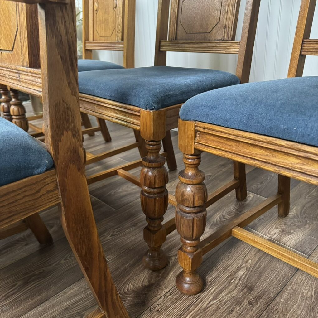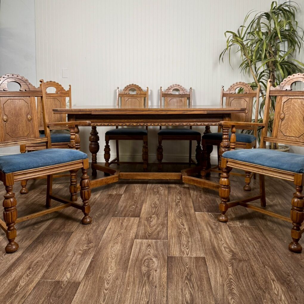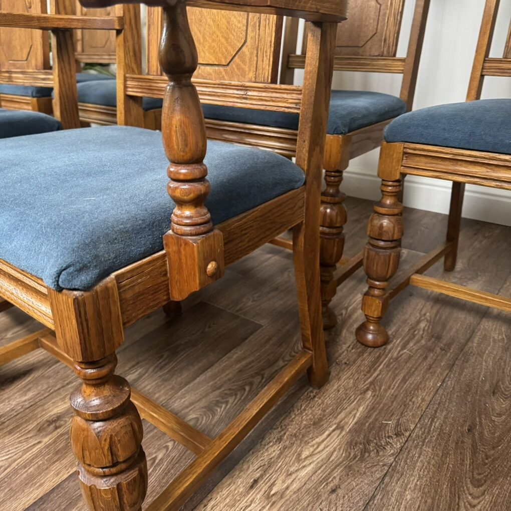 VenmoElegant set of six antique solid oak dining chairs, including two armchairs and four side chairs. Features Jacobean-style turned legs and pierced “crown” crests on the backs. The upholstered seats are clean and comfortable. These are beautifully proportioned, sturdy, and comfortable—perfect for everyday dining or a formal occasions. Some minor age-appropriate wear.