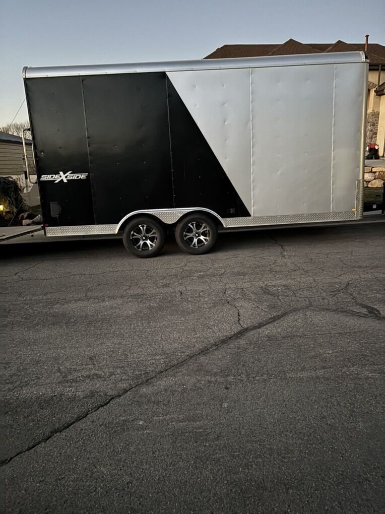 VenmoEnclosed trailer in good condition. New tires. Aluminum wheels. Lights inside and outside. 3 cargo tiedowns in front of trailer and 3 in back of trailer. 2 way 110 outlet inside trailer.