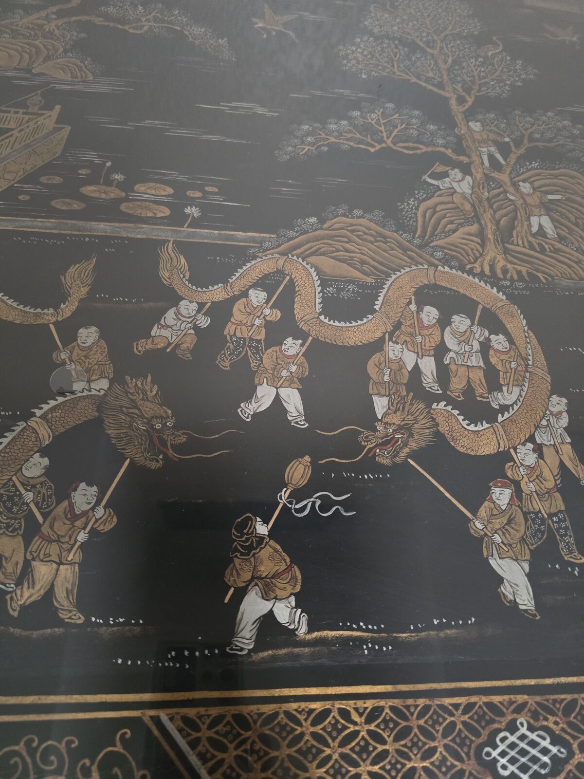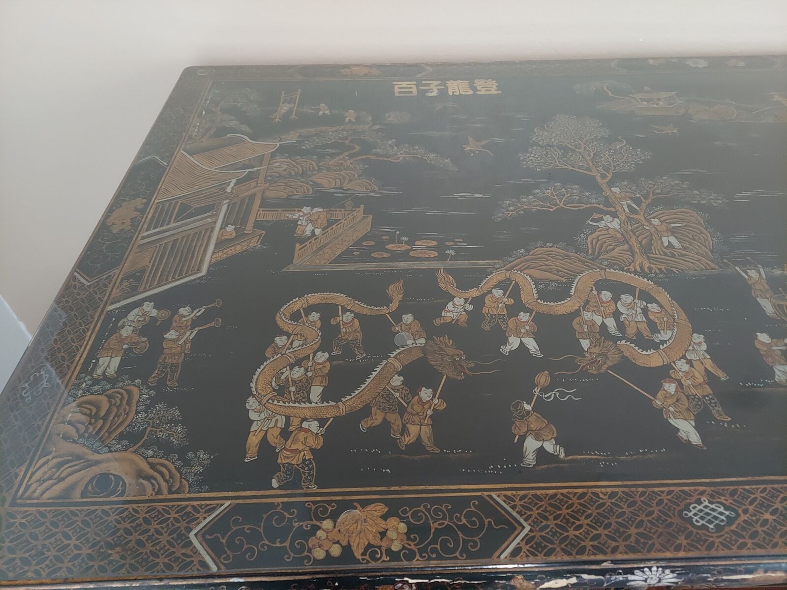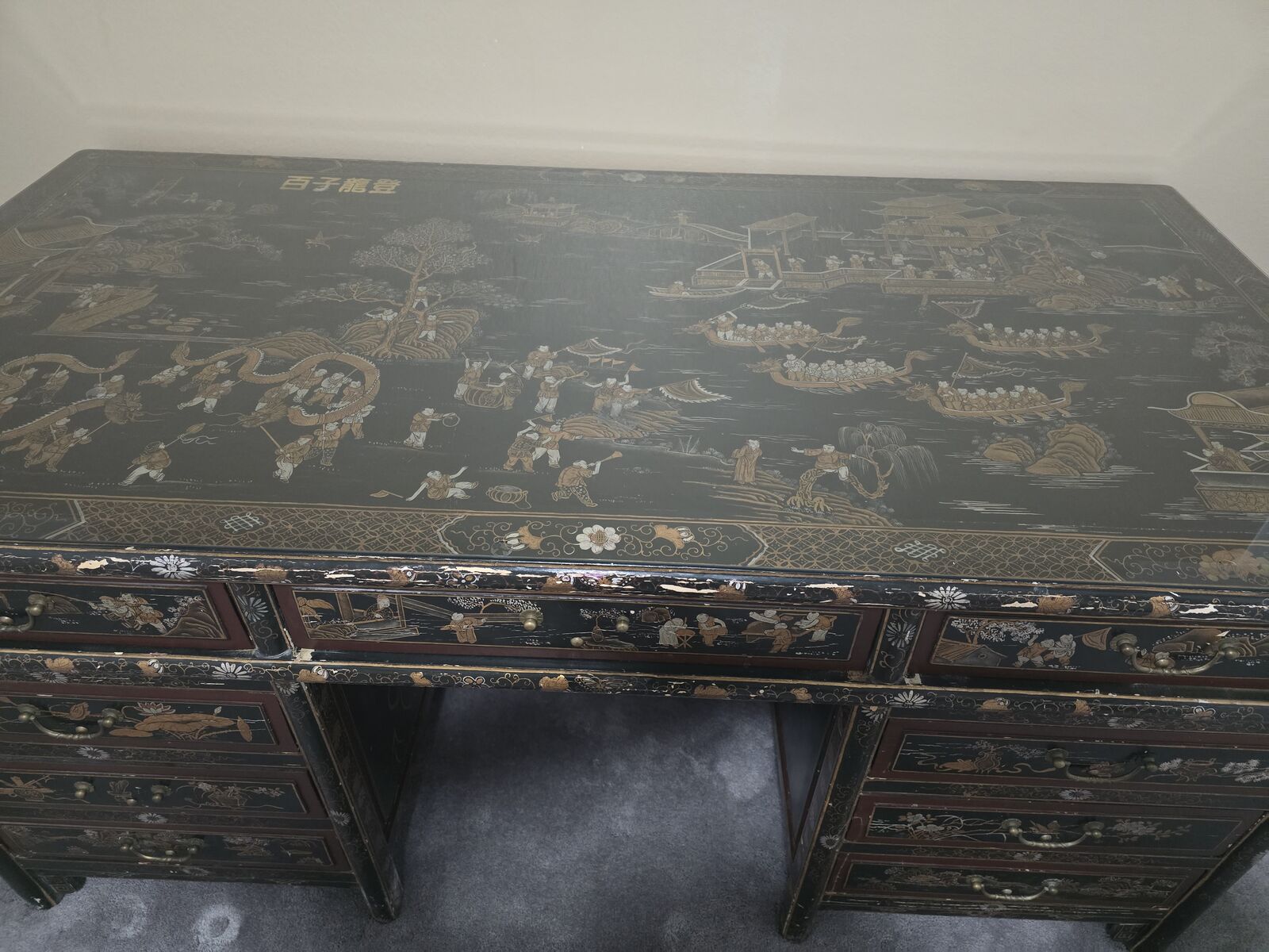 VenmoThis is a one of a kind find that would look great in a professional office setting or a collector's home Chinoiserie-Style. When you open the draws you can smell the ceder wood. It has a two small tack nails that make the back of the top draws other than that you will not find another nail or screw that was used to craft this unique piece. The top sets on top of four dowels that are built on the top of the two ends. This desk is 4 pieces including a glass top to protect it. Won't lie it does have a few minor chips on a couple edges but over all its a eye catcher and amazing piece.