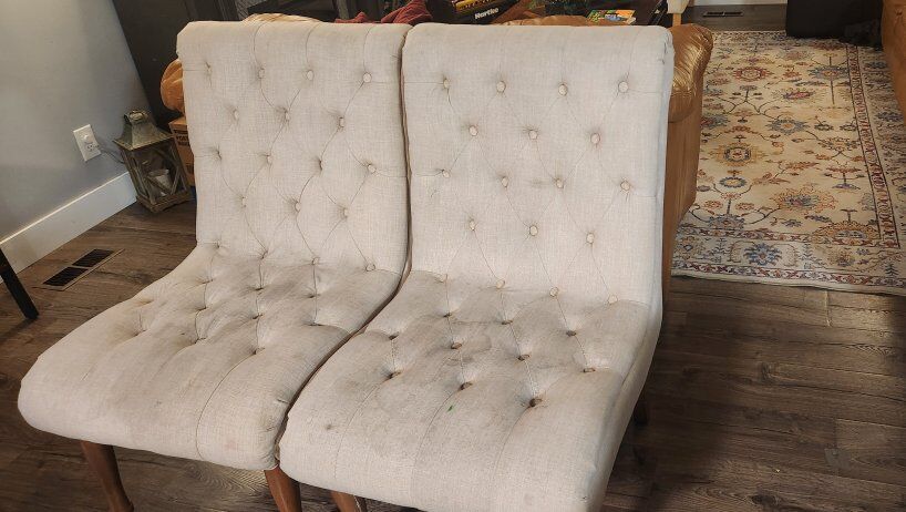 Good condition. We got a couple of different pieces of furniture and these chairs no longer work for our space.