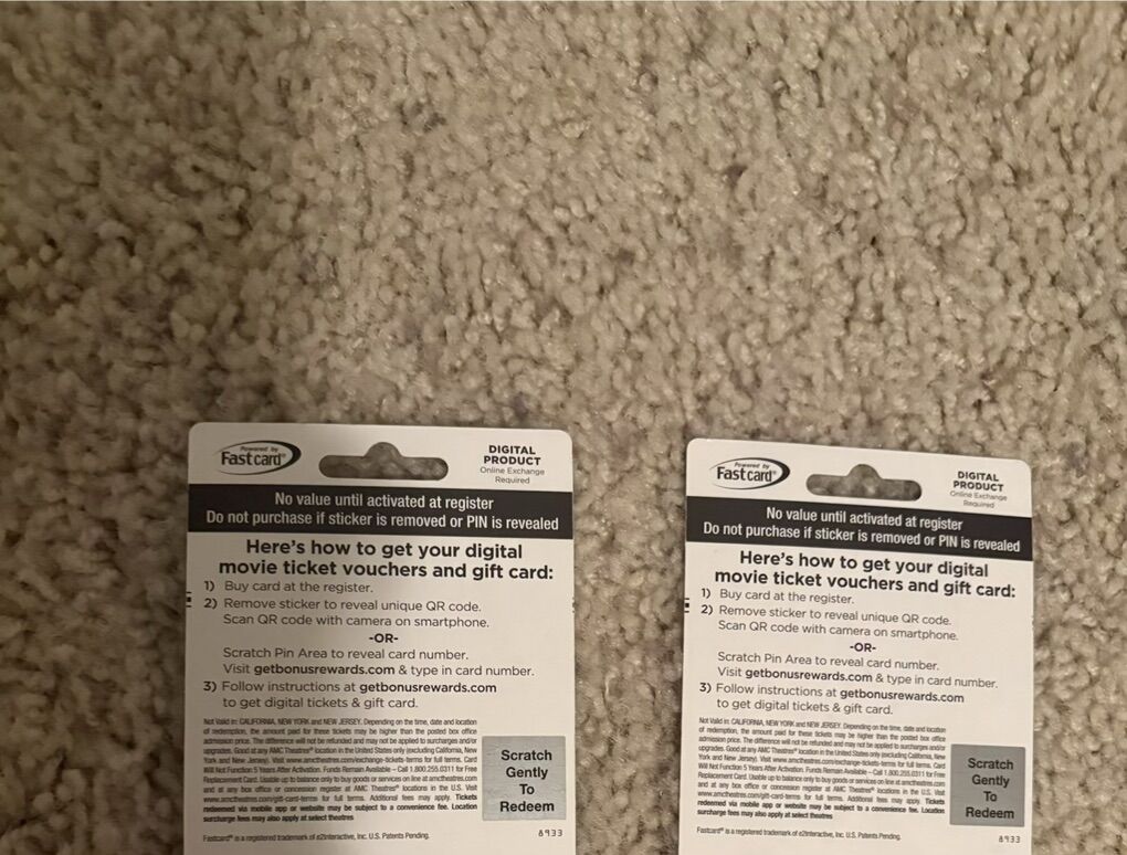 Two gift cards each with $20 and two free movie tickets