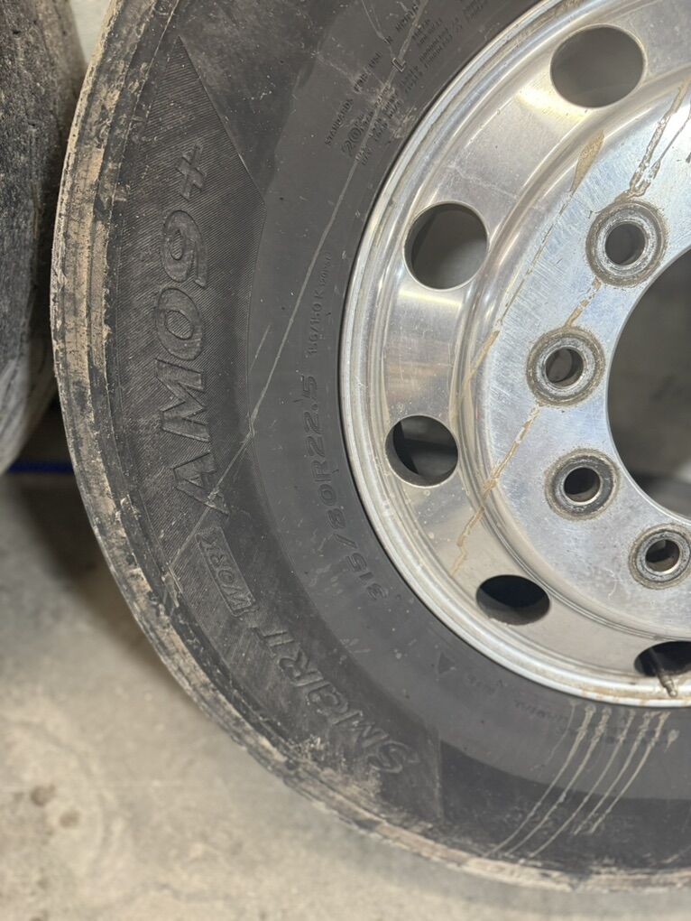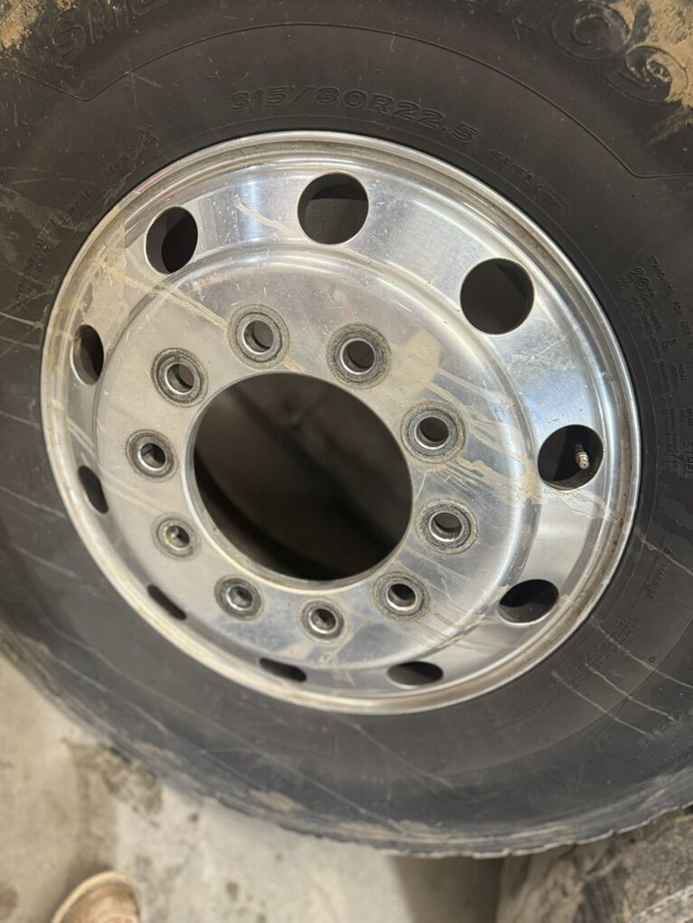 Hankook Amo9+ 315/80r22.5 on Aluminum 22.5x9 hub pilot wheels. Tires have a little life left in them Polished wheels they are a little dull. No grooving in the wheel lips no pitting in the faces Wheels are about 3 years old tires are a year old Tires and wheels are rated for 10,000 pounds each. Call or text anytime 435-671-5811 for the set will not split them