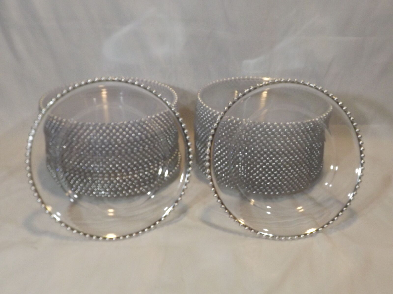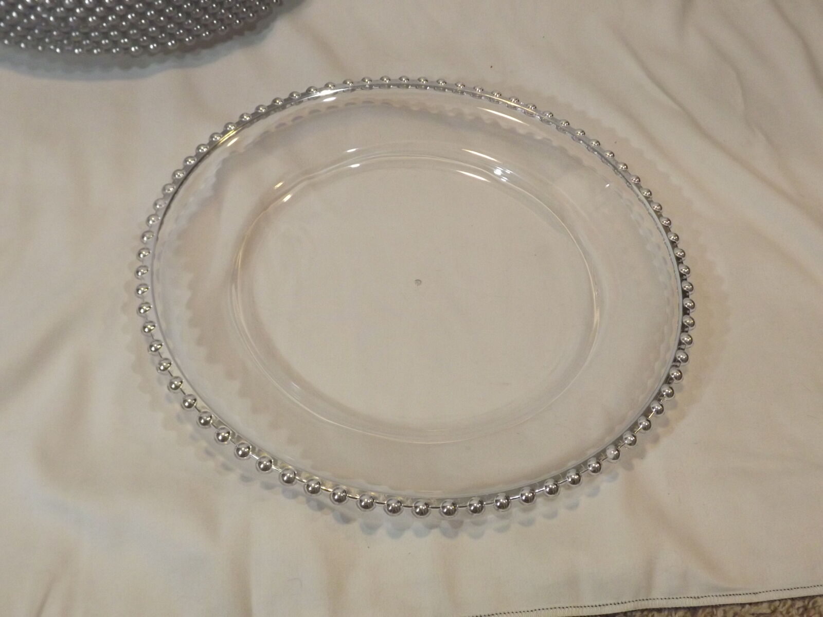 VenmoFull bulk lot of 50 heavy-duty clear acrylic charger plates / serving trays with elegant silver beaded edges. These are not flimsy disposable plates — they are sturdy, reusable, and designed for real event use. Perfect for: Weddings & receptions Event planners & decorators Catering & buffet service Churches & banquet halls Party rental companies Resellers building inventory Details: Heavy-duty clear acrylic Silver beaded rim Stackable & easy to store Neutral design works with any theme Easy to clean and reuse Pricing Breakdown: Retail equivalent is typically $6–$10 per plate. This bulk lot works out to $3 per plate, saving hundreds vs retail or online bulk orders. Selling as one lot only $135 takes all 50