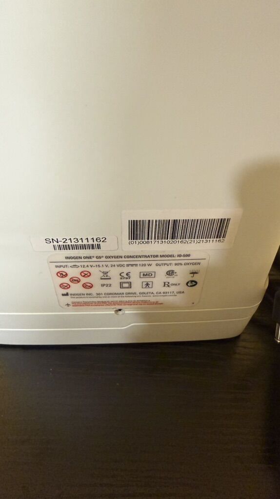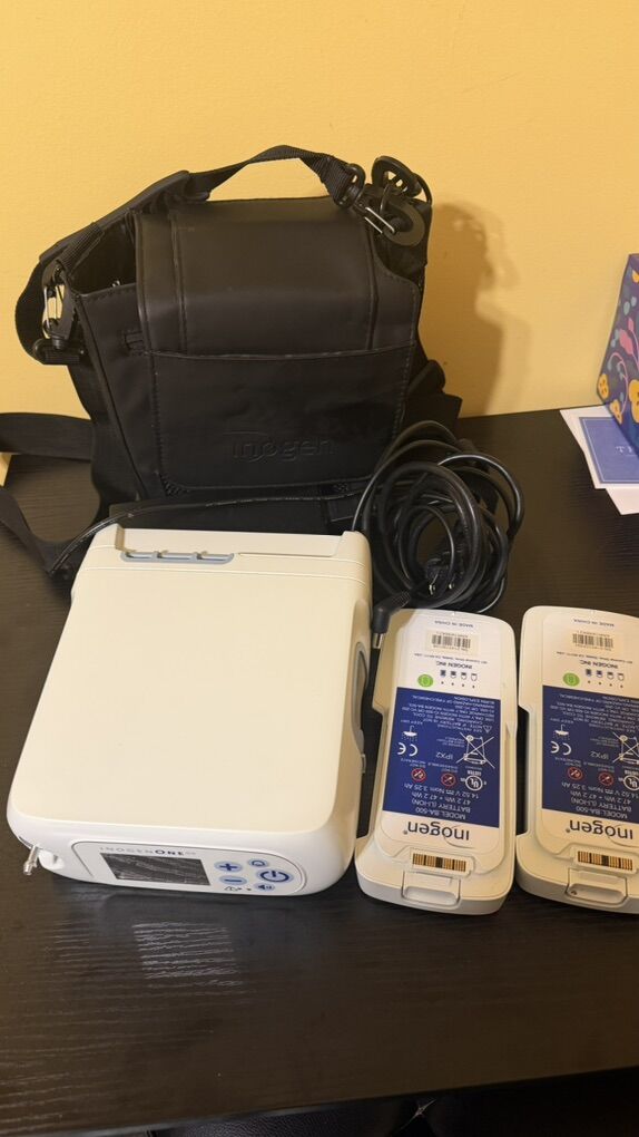 Lightly used 2 Batteries included OBO make an offer The Inogen One G5 is designed to provide supplemental oxygen for individuals with respiratory conditions, offering high flow and portability. Oxygen Flow: Pulse dose delivery system with 6 flow settings (1-6). Maximum Oxygen Output: 1,260 mL/minute (1.26 LPM). Oxygen Concentration: 87% to 96% at all settings. Weight: 4.7 lbs (with single 8-cell battery); 5.7 lbs (with double 16-cell battery). Dimensions: 7.19 L x 3.26 W x 8.15 H (with single battery). Battery Duration: Single Battery: Up to 6.5 hours (at flow setting 1). Double Battery: Up to 13 hours (at flow setting 1). Noise Level: Approximately 38 dBA at setting 2, which is comparable to a quiet library. Operation: Can be run on rechargeable lithium-ion battery, AC (wall) power, or DC (car) power. Technology: Features Inogen's patented Intelligent Delivery Technology® which adjusts oxygen delivery to a user's breathing rate, even during sleep. Connectivity: Bluetooth-enabled for use with the Inogen Connect App to monitor battery life, column status, and other device functions. FAA Approval: Meets all FAA requirements for use on commercial aircraft. Maintenance: Minimal, primarily involving regular cleaning of the reusable particle filter and annual replacement of the sieve beds (metal columns), which can be done by the user. Reviews and Usability The Inogen One G5 is a popular choice among users for its balance of power and portability. Portability: Reviewers praise its lightweight and compact design, making it suitable for active individuals and travel. Battery Life: The extended battery options are a significant highlight, allowing users to go out for longer periods without needing a recharge. Quiet Operation: Its low noise level makes it a good option for social settings and nighttime use without causing disturbance. Limitations: It is a pulse-dose only machine and is not intended to be life-sustaining; an alternate oxygen source is recommended in case of power failure or mechanical issues. It also cannot be used with a CPAP or BiPAP machine, which requires continuous flow oxygen.