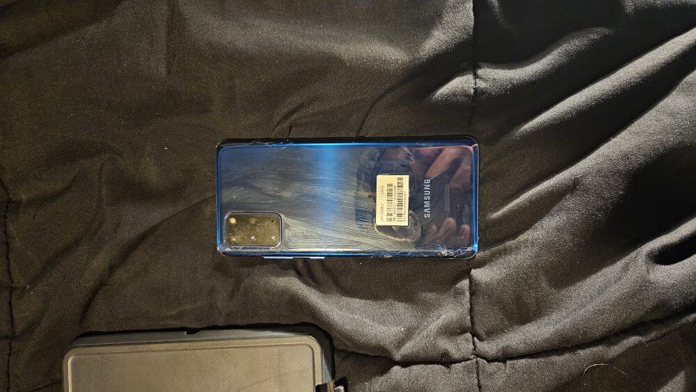 Samsung Galaxy S20+ 5G 128GB Aura Blue. The back glass has some cracks, the front facing camera has some black spots, and the screen has some pixels burnt out at the top. Comes with a three piece Otterbox style case.
