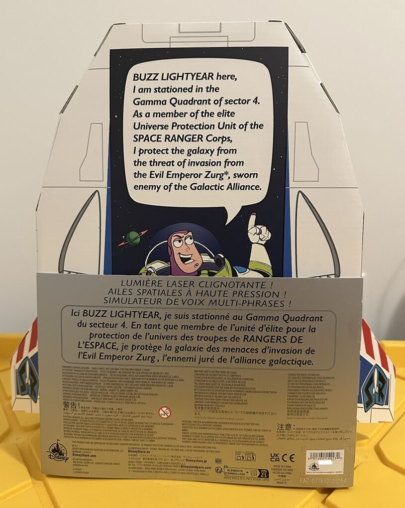 This was a Disney Store/ShopDisney exclusive toy. Now sold out & discontinued. This Buzz finally has a movie accurate box package just like it’s seen in the first two Toy Story films! More accurate than the highly sought after signature collection Buzz Lightyear! Price will keep going up as it becomes harder to get. The front silver sleeve is removable revealing the entire movie accurate box.