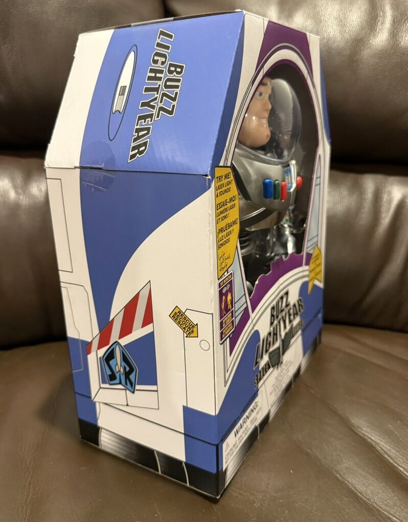 It’s new. This was a ShopDisney/Disney Store exclusive limited release. Features include chest buttons to activate voice phrases, wrist communicator, arm laser, retractable helmet, karate chop action & pop out light up wings. It has mostly all play features like in the movies!