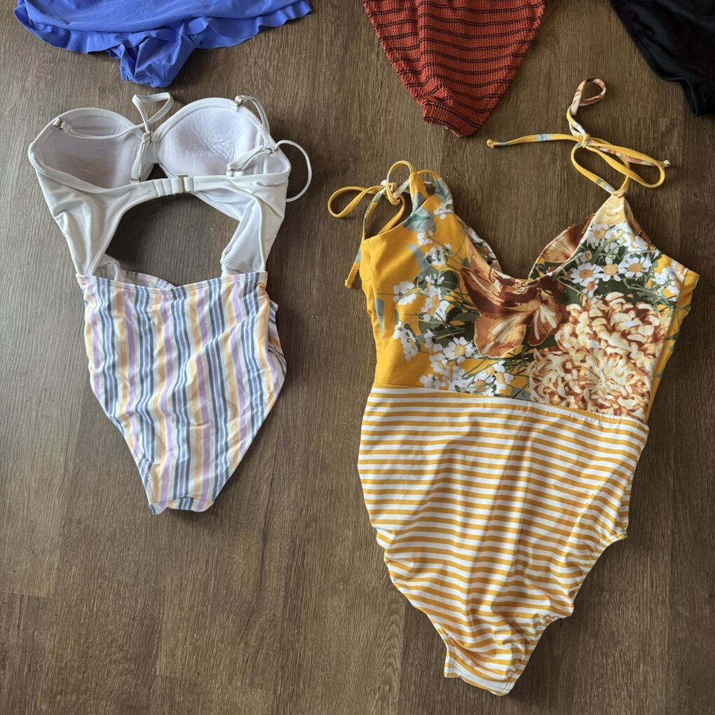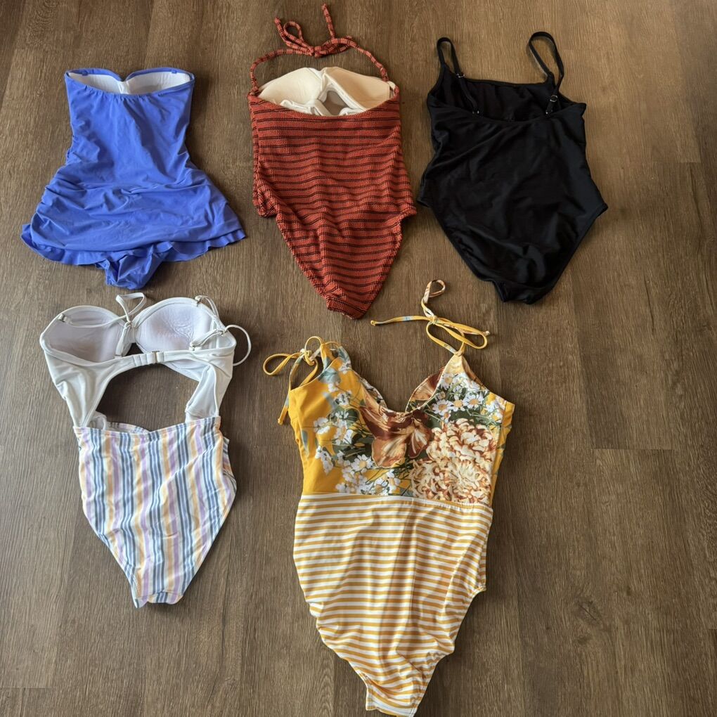 Women’s One Piece Swimsuits Size Medium A Profile by Gottex Tutti Frutti Swimsuit Swimdress Size 6 $45 does have a few areas where the stitching is coming undone B Kona Sol Koni Sol Copper Stripe Pucker One Piece Swimsuit Size M $10 C Shade & Shore Women's Mesh Front One Piece Swimsuit M $10 the elastic shows some wear in the mesh area D Xhilaration One Piece Front Cut Out Striped Swimsuit M $15 E Albion The Rachel One Piece Swimsuit Size Medium $60 does have a few areas where the stitching is coming undone