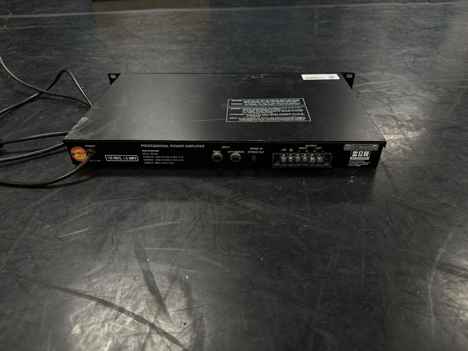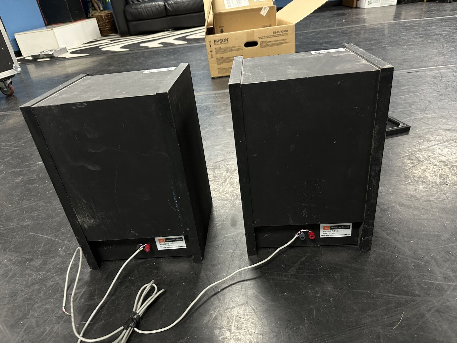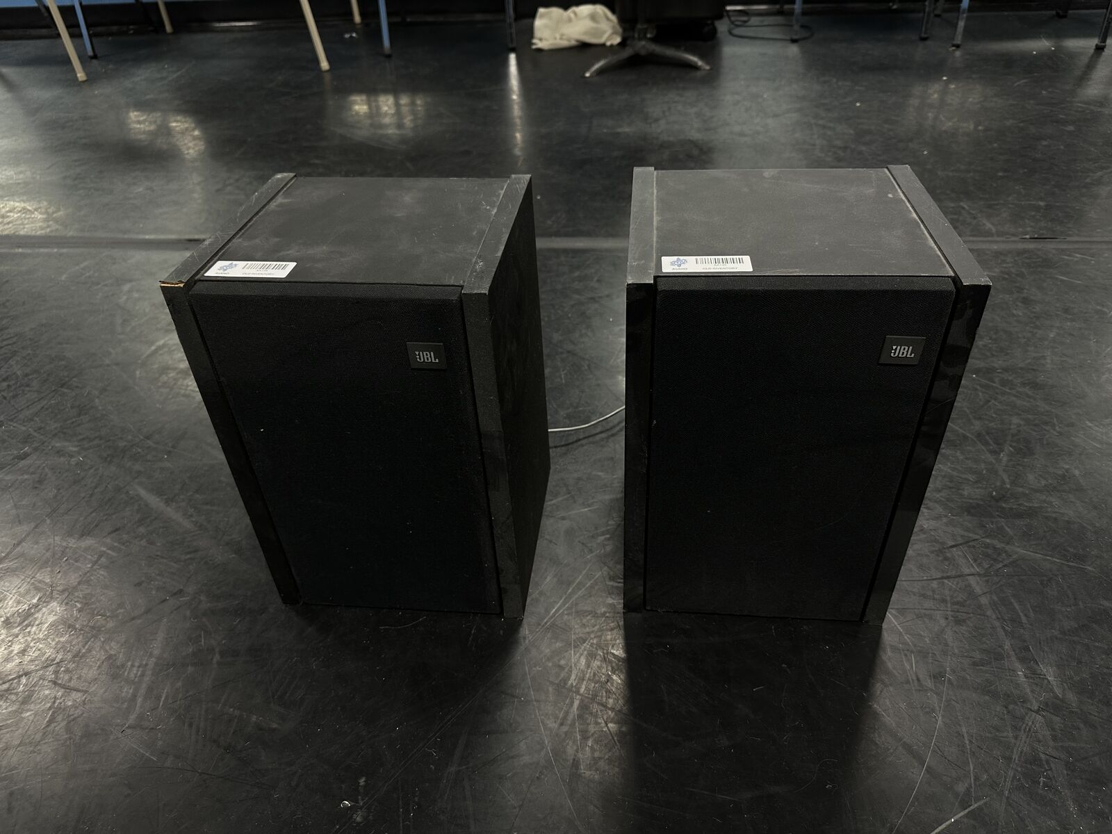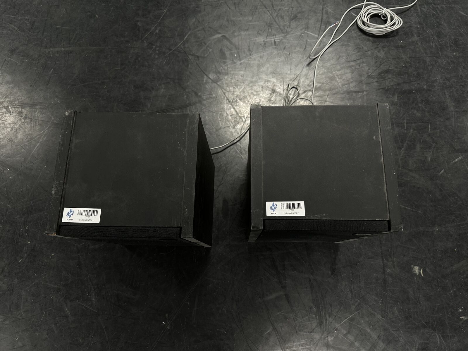 This speaker pair has been tested and is working. The knobs on the amplifier crackle when used, but once set they work fine. One of the speaker drivers appears to have been reconed (see pictures), but they are in working order.