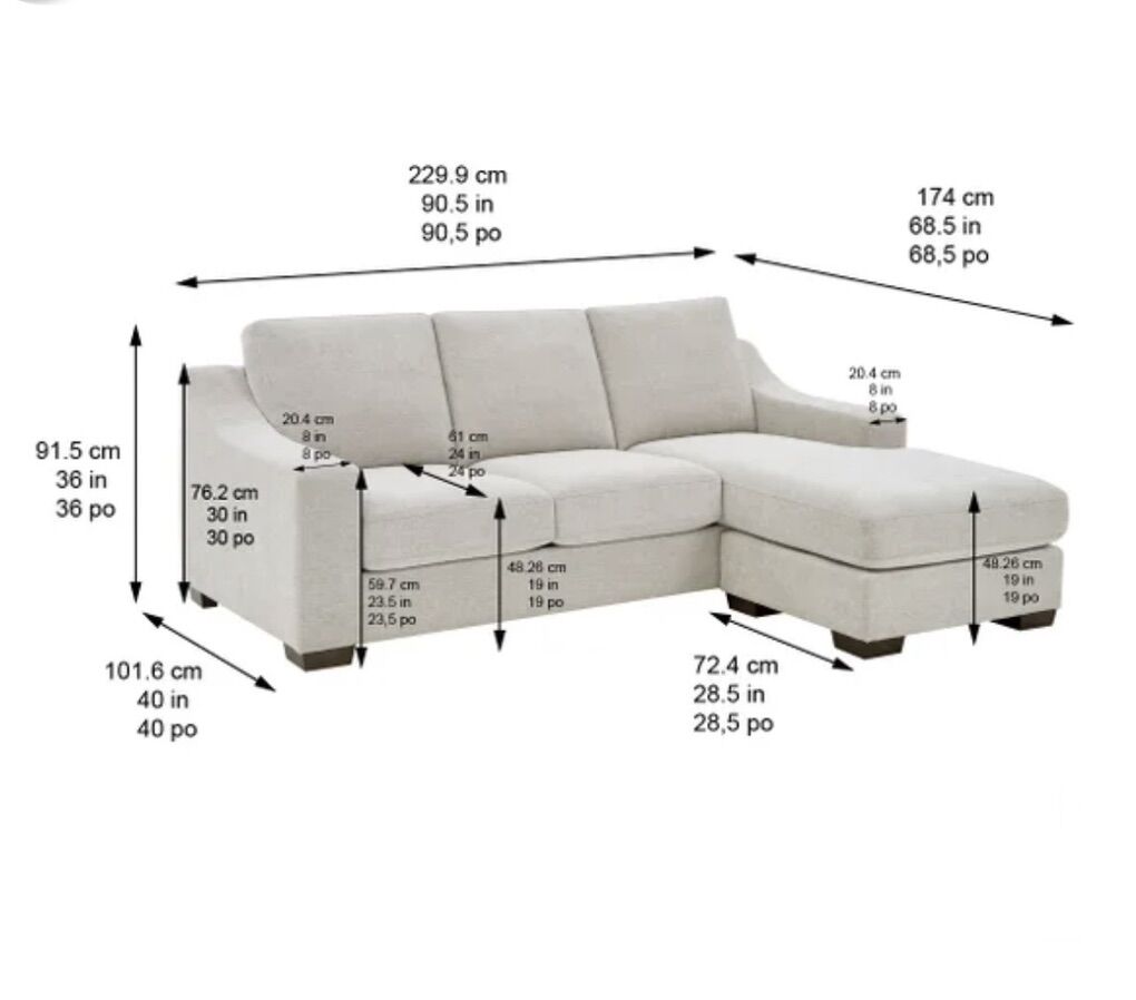 Overall Dimensions 229.9 cm L x 174 cm W x 91.5 cm H (90.5 in. L x 68.5 in. W x 36 in. H) Seat Height 48.3 cm (19 in.) Seat Depth 61 cm (24 in.) Back Height - not including back cushions 76.2 cm (30 in.) Back Height - including back cushions 91.5 cm (36 in.) Arm Height 59.7 cm (23.5 in.) Arm Width 20.3 cm (8 in.) Overall Sectional Weight 81.9 kg (180.6 lbs.) Weight Capacity 113.4 kg (250 lbs.) per seat Stationary Sofa Dimensions 229.9 cm L x 101.6 cm W x 91.5 cm H (90.5 in. L x 40 in. W x 36 in. H) Left Arm Facing Sofa Weight 69.4 kg (152.9 lbs.) Ottoman Dimensions 82.6 cm L x 72.4 cm W x 25.4 cm H (32.5 in. L x 28.5 in. W x 10 in. H)