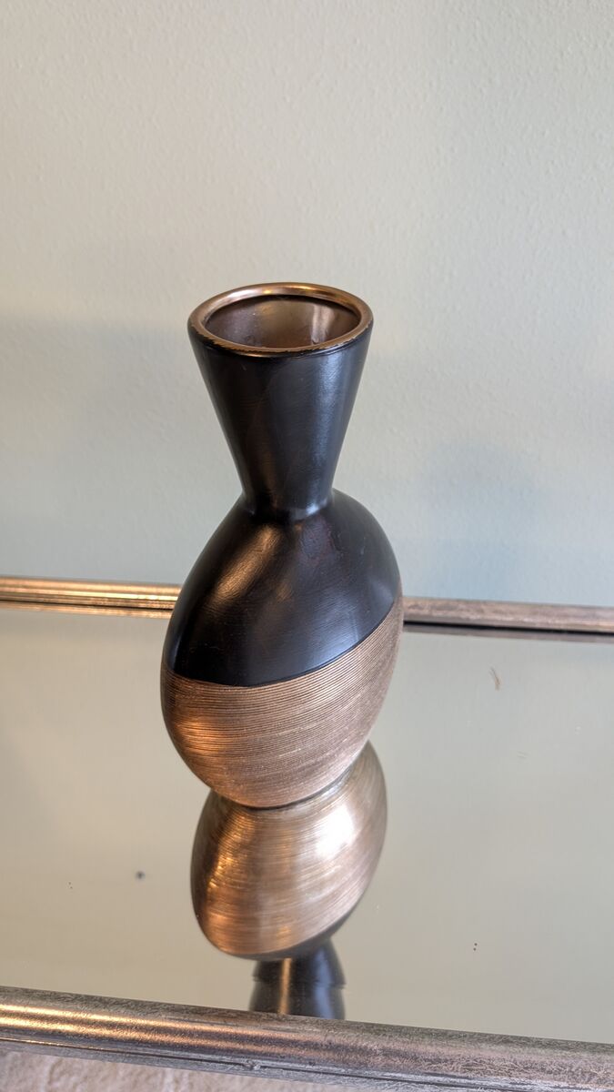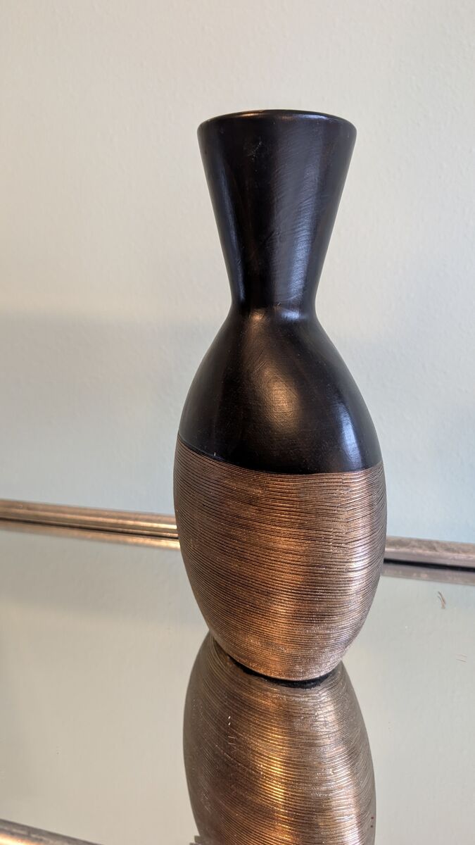 Pottery vase with a black top and a bronze base that is textured to look like wire wrapped around the vase. It is in excellent condition.