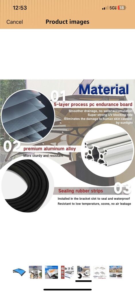Creates peaceful environment with rainfall noise reduction Summarized from product information Rufus AI UPF 50+ Sun ProtectionExperience the benefits of UPF 50+ sun protection with our awning for door entrance . Unlike most alternatives, this canopy effectively blocks sunlight and UV, keeping your outdoor space cool.It also offers great rain protection, giving you and your family a comfortable, covered outdoor space to enjoy throughout the year. Premium MaterialOur awning for door entrance is made from premium materials, including transparent polycarbonate panels and robust aluminum alloy brackets. This design is shock-resistant and noiseless, capable of withstanding up to 220lbs/100kg. Whether facing strong winds, heavy rain, or snow, our awnings for doors ensures durability and stability, offering a peaceful and fire-resistant shelter for enhanced safety. All-Weather ProtectionThis door awnings exterior offers comprehensive protection from rain, snow, sun, and UV rays throughout the year. Enjoy the rain without getting wet or worrying about water leakage. During summer, our awning effectively blocks harsh sunlight and UV rays, providing a cool and comfortable entrance area. Effortless InstallationDesigned for easy assembly, our window awnings exterior features solid aluminum alloy components and comes with detailed instructions and illustrations. The DIY setup is straightforward, but for optimal results and safety, We recommend two people to assemble the door window canopy. Versatile ApplicationsOur window door awning the settled balance between light blocking and brightness, making them suitable for various settings. Whether for front and rear doors, bedroom windows, balconies, swimming pools, cafes, offices, or commercial streets, our awnings for patio enhance any space with their aesthetic appeal and functionality.