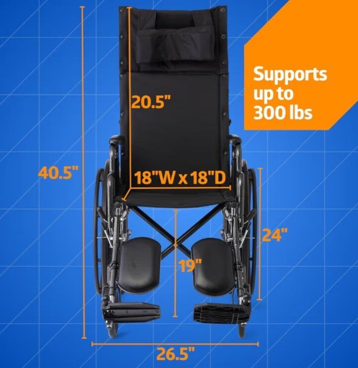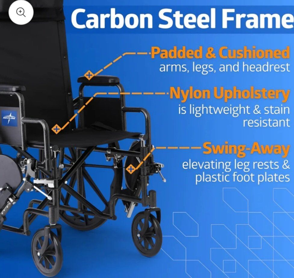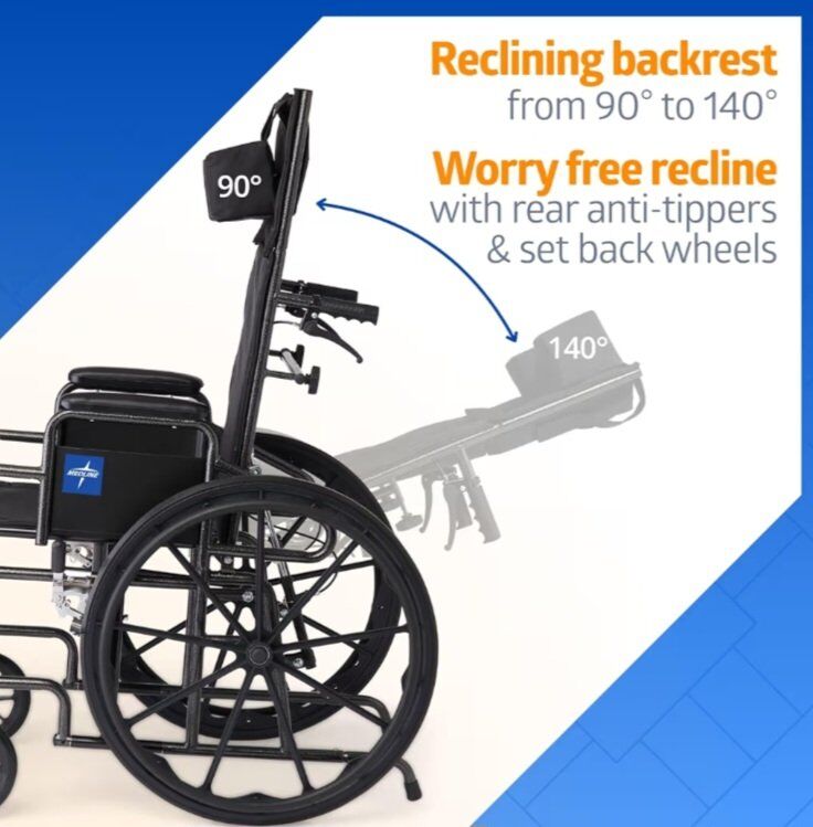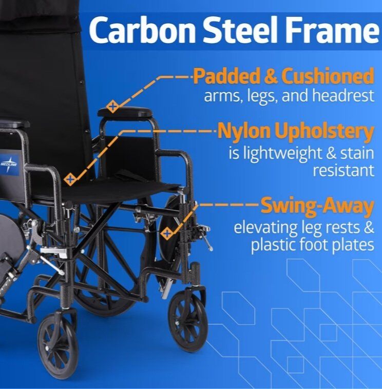 Medline Reclining Wheelchair, 18", with Elevating Leg Rests, Durable Vinyl, 300 lb. Weight Limit, Reclines 90 to 140 Degrees