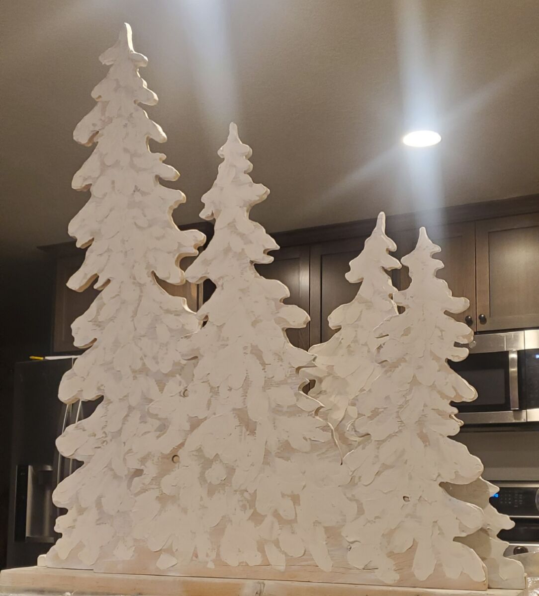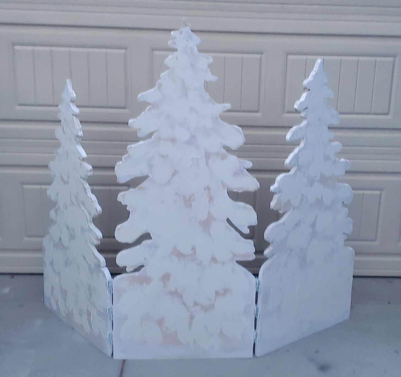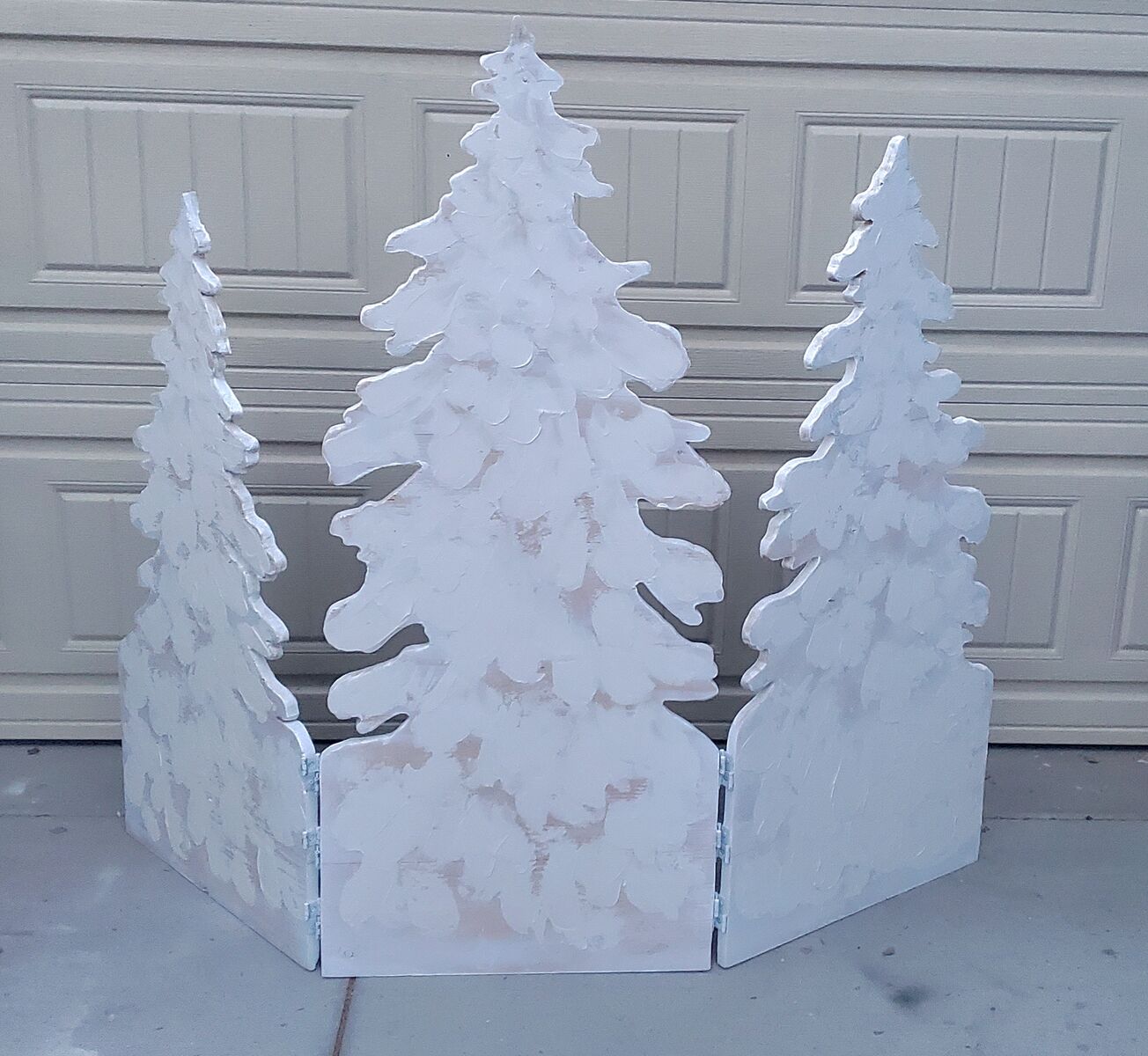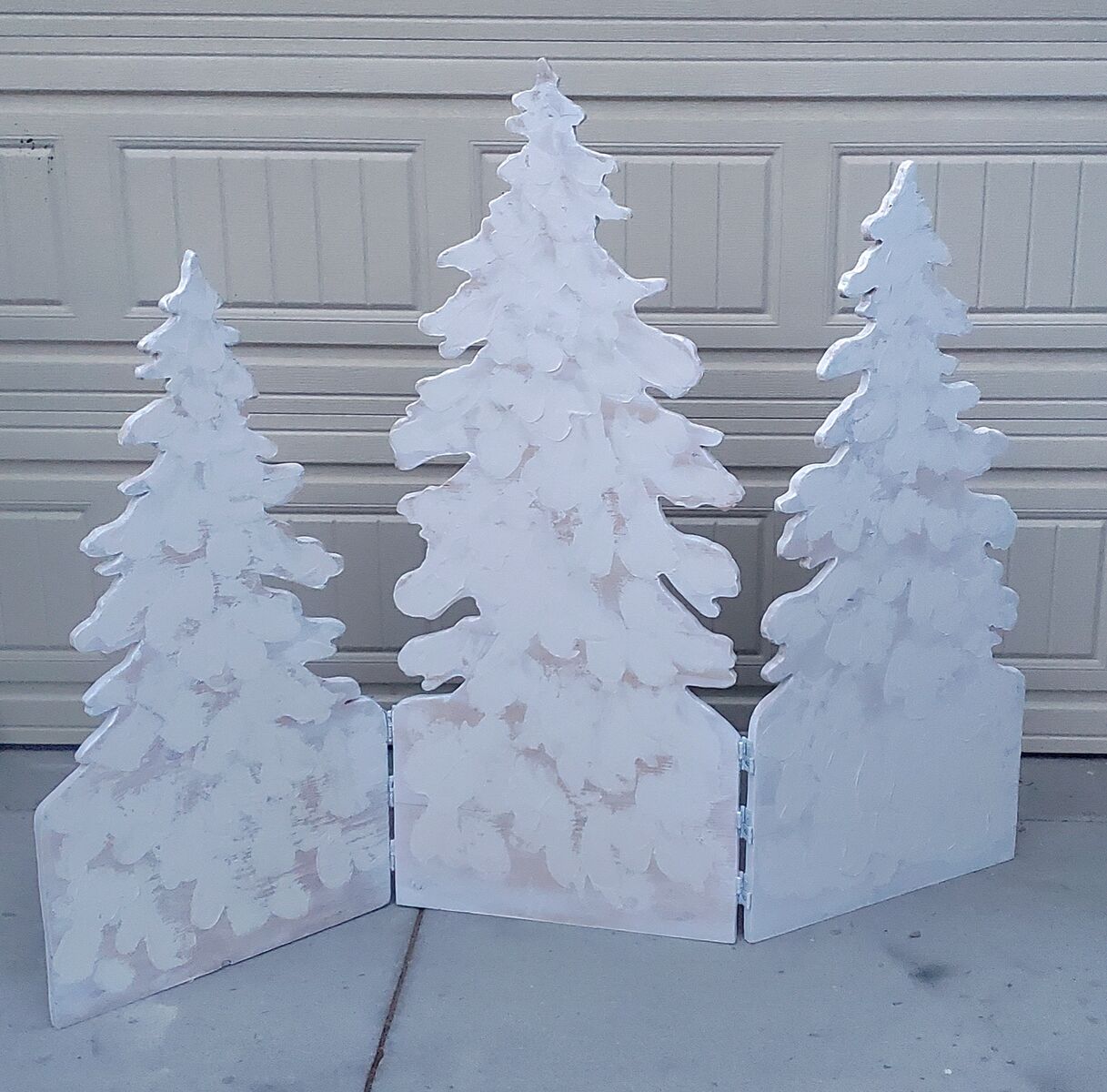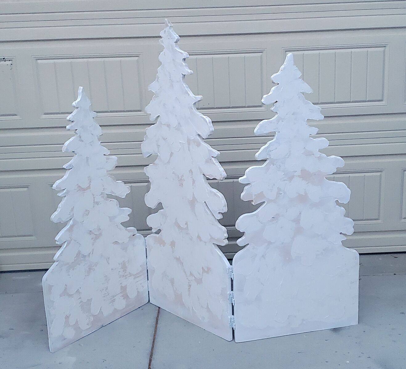 This charming UNIQUE trio of trees has been artistically hand crafted, handpainted, and hand textured out of plywood to create a magical, snow-covered winter wonderland look as a backdrop for your Holiday decor, winter wedding, or event. The dual-acting hinges make it so that it can be configured into many different positions. Would be easily enhanced by adding white Christmas lights on it. It folds flat for transport, and storage. *Meant for interior use only.