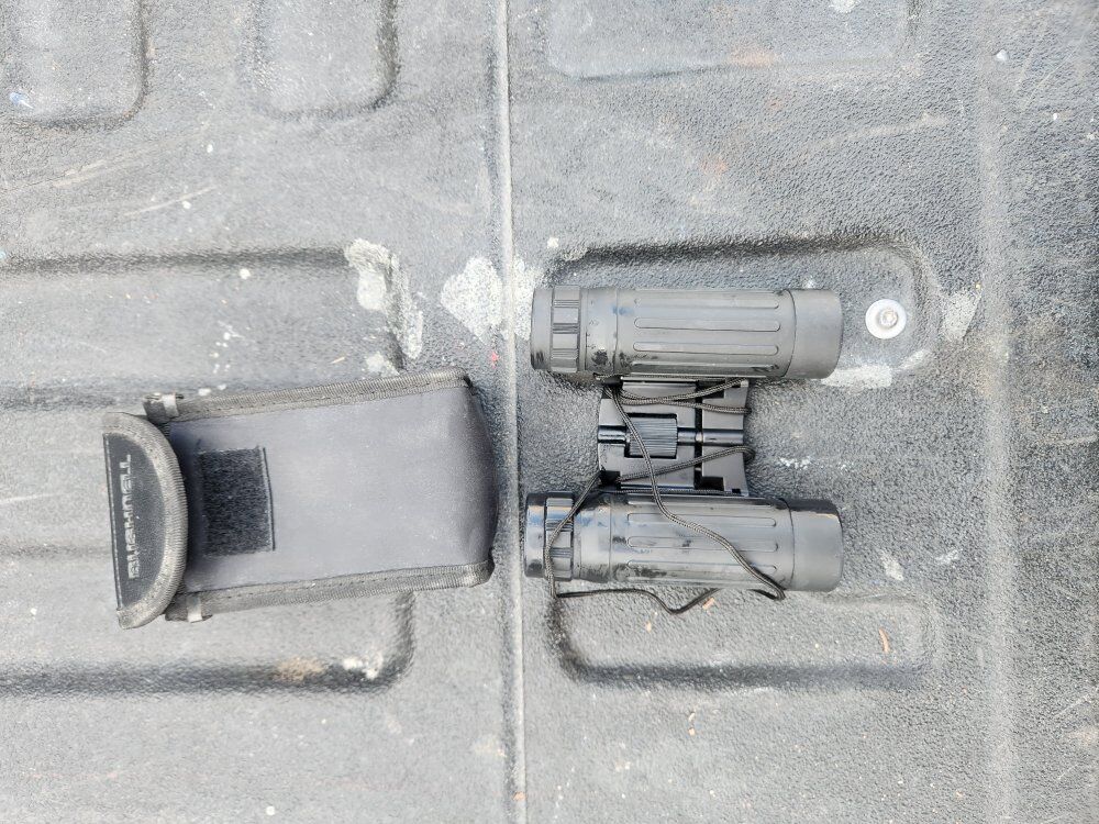 Bushnell 12x25 binoculars. They are compact roof prism binoculars. The magnification is (12\times ) and the objective lens diameter is (25\text{mm}). The field of view is (240\text{ft}) at (1000\text{yds}). They are part of the PowerView series, which features fully-coated optics for bright, vivid images. Some versions (H2O) are waterproof and fogproof with an aluminum body.