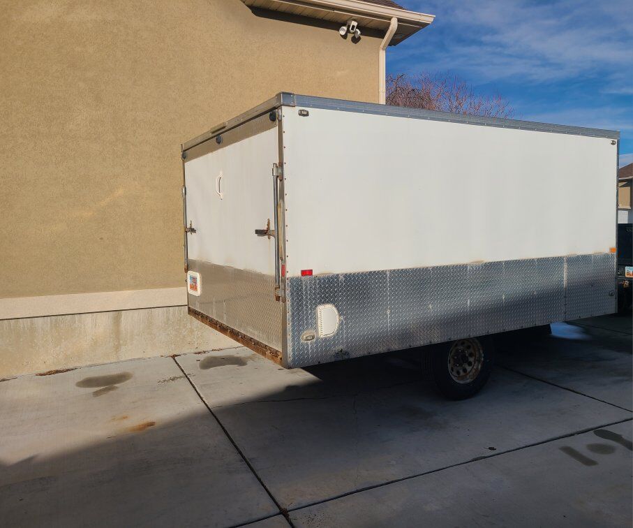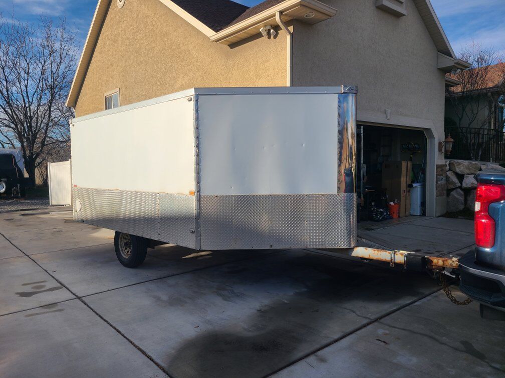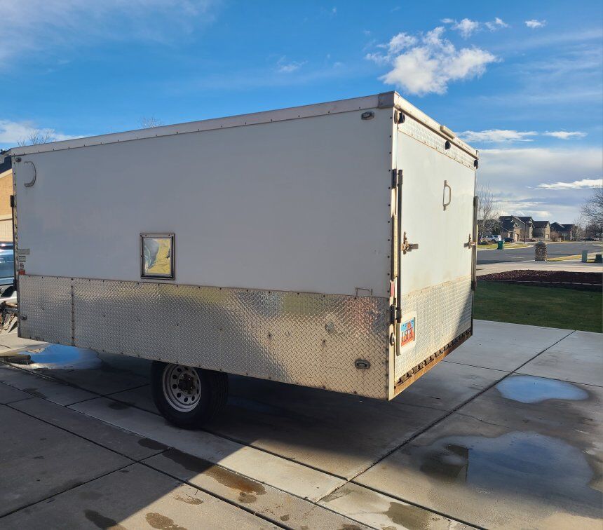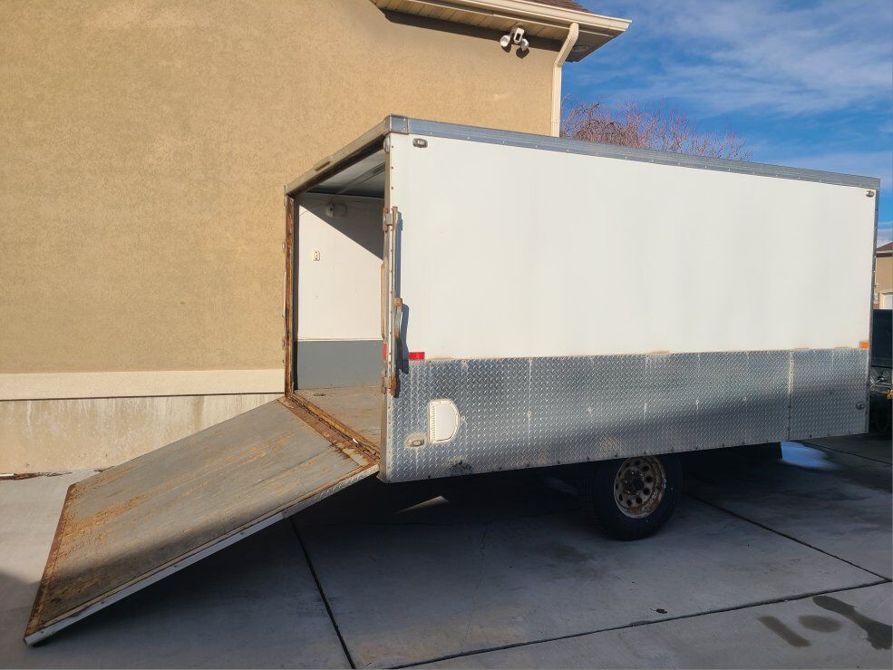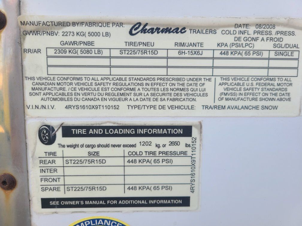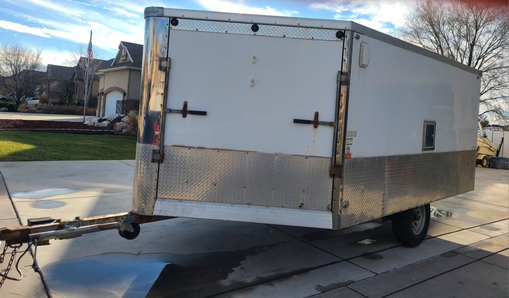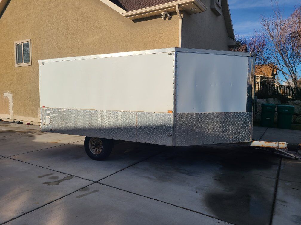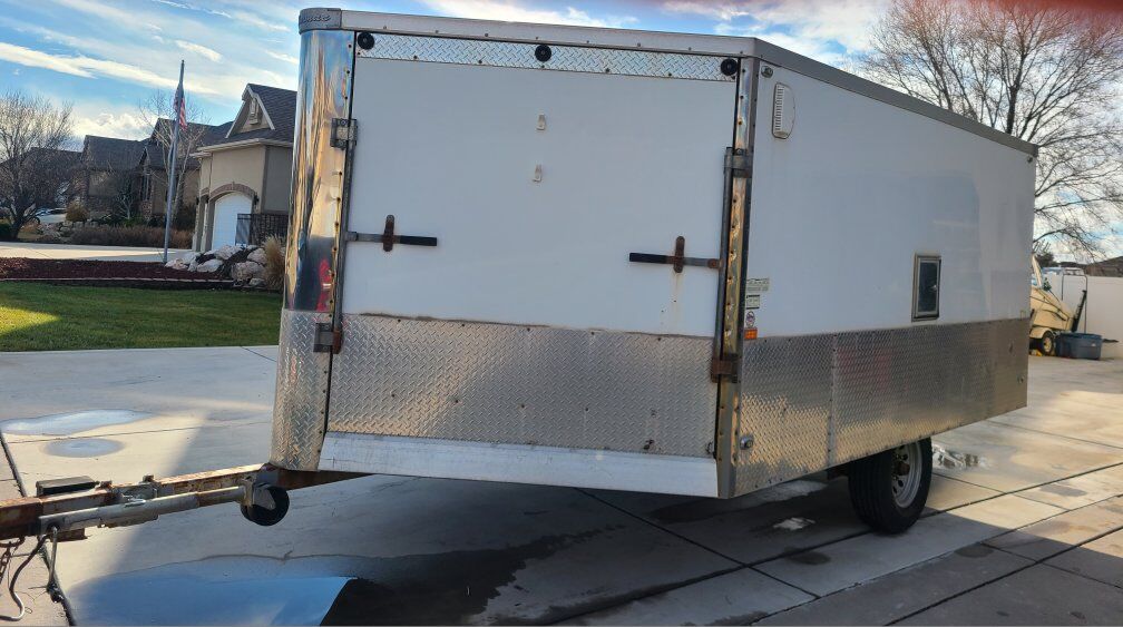 Charmac enclosed cargo snowmobile trailer with brand NEW tires. Drive in and drive out ramp door up front and in back, even has a fuel door on the side for quick fuel ups.