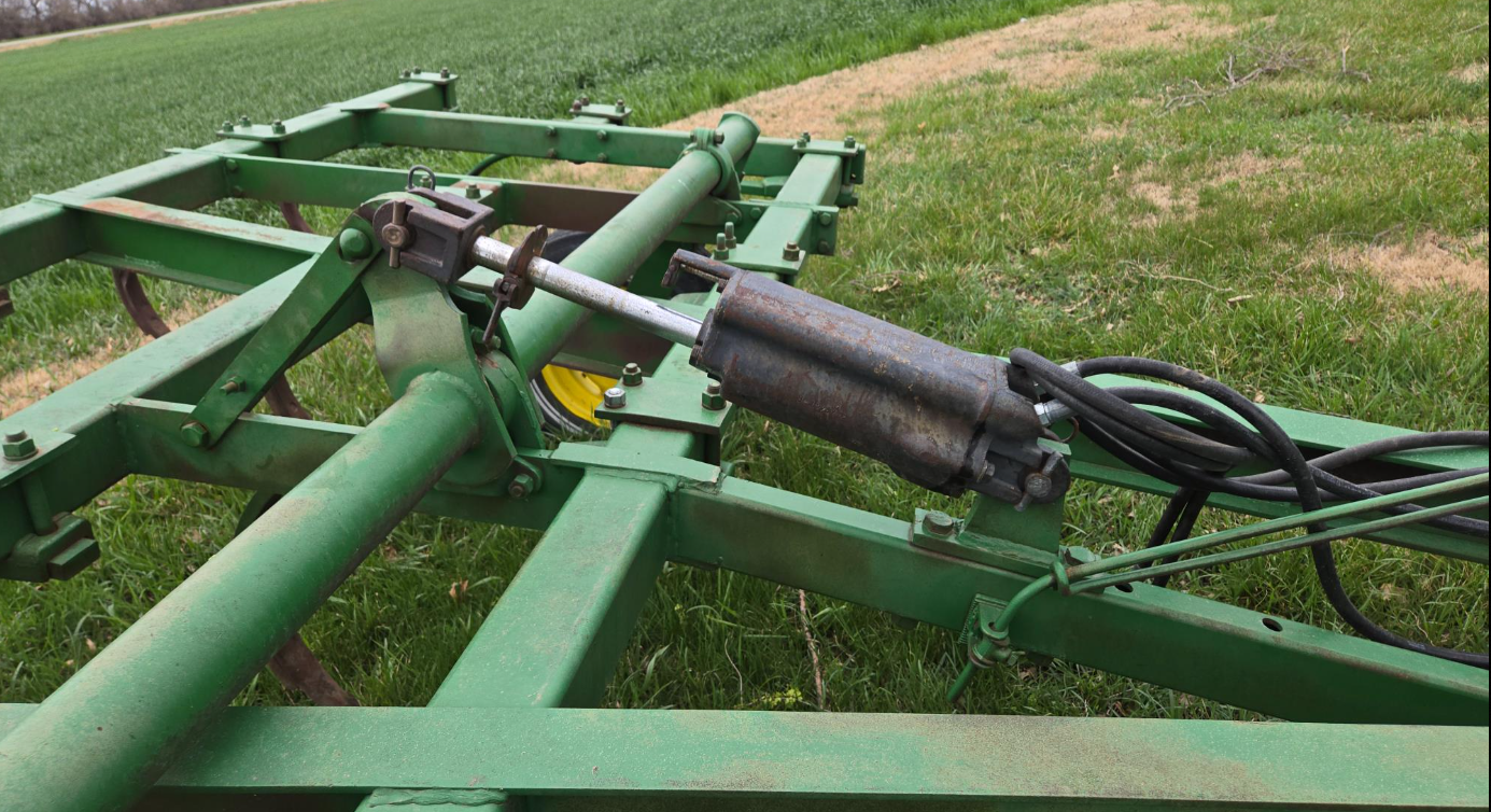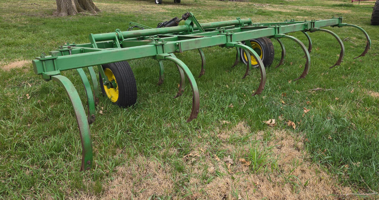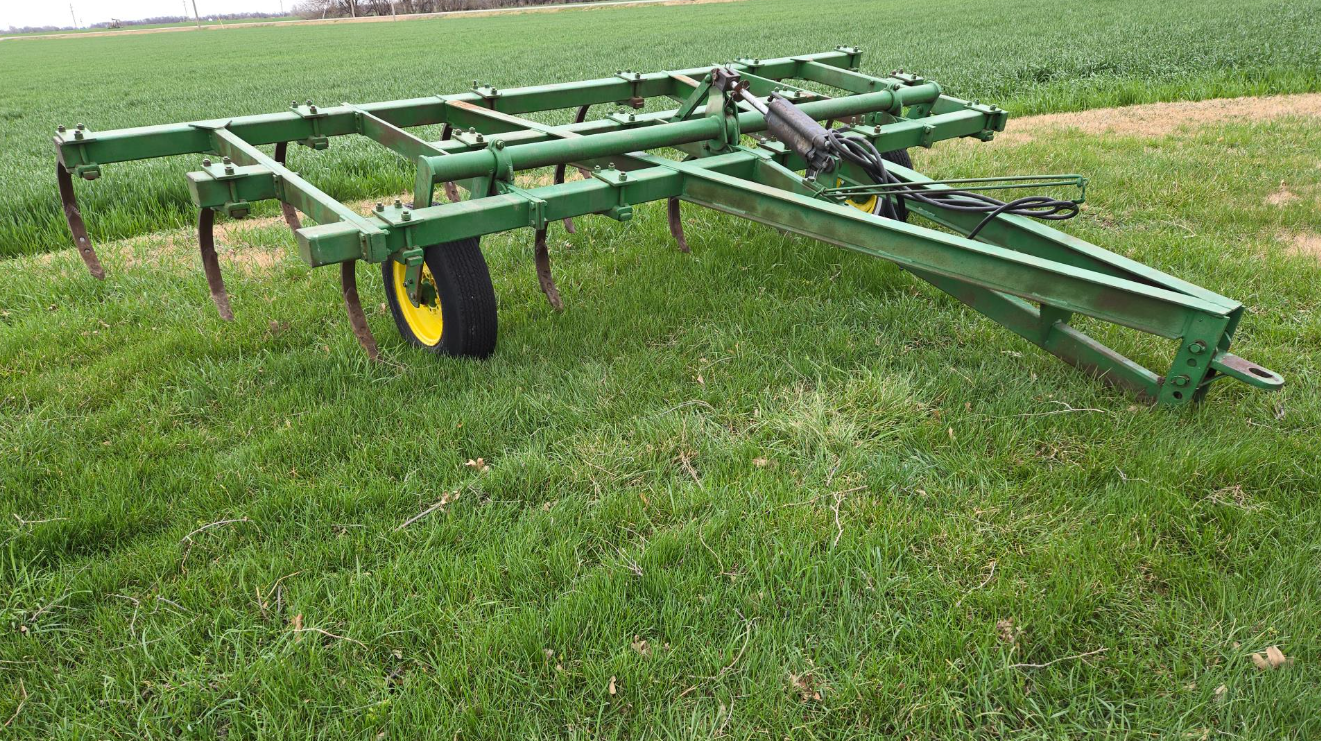 John Deere Pull-Type Chisel Plow, 16' Wide, 2 Wheel, Hydraulic Cylinder, Adustable Hitch, Tow Welded Chisel Shanks, 15" Tires On 6 Bolt Wheels