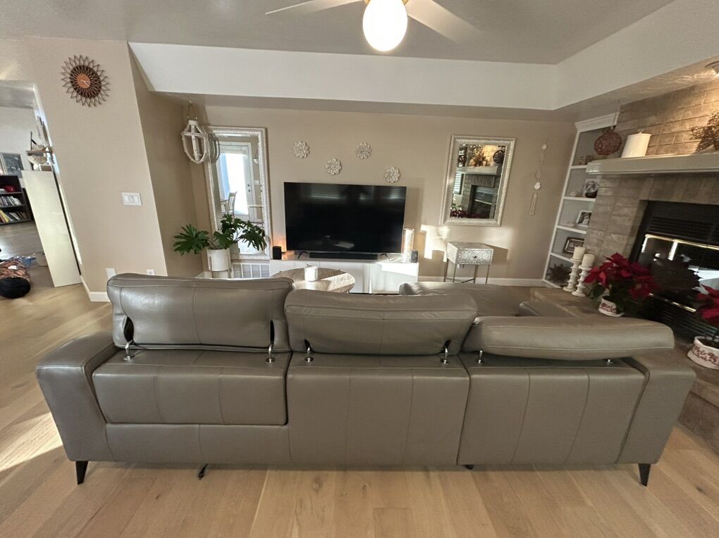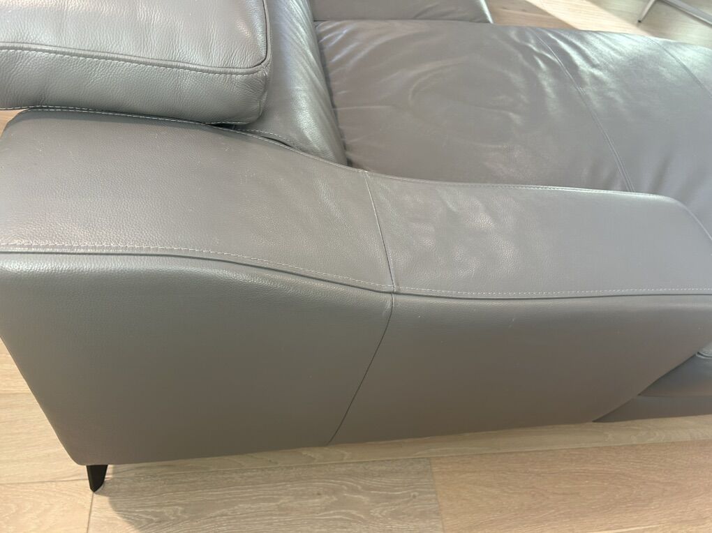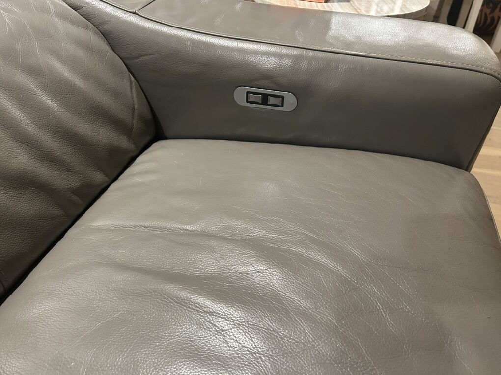 ApplePayGrey Leather Power Reclining Sectional Sofa with Adjustable Headrests. This sectional is in 2 pieces. One chaise is fixed and the other side is extendable and has electric motor to recline. Measures 101 x 68 x 30.5 inches. Good used condition. No rips or tears. Smoke-free home.