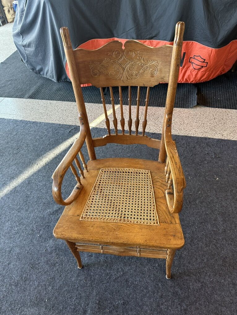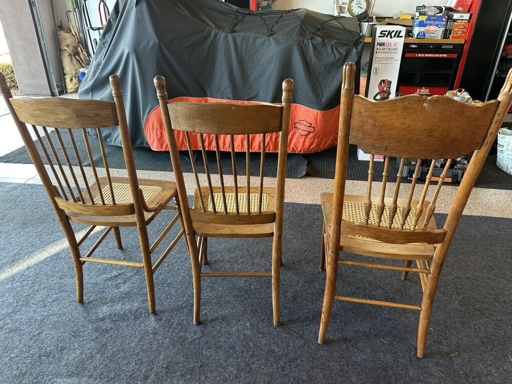 Zelle4 antique oak caned chairs. Beautiful condition. Caning replaced