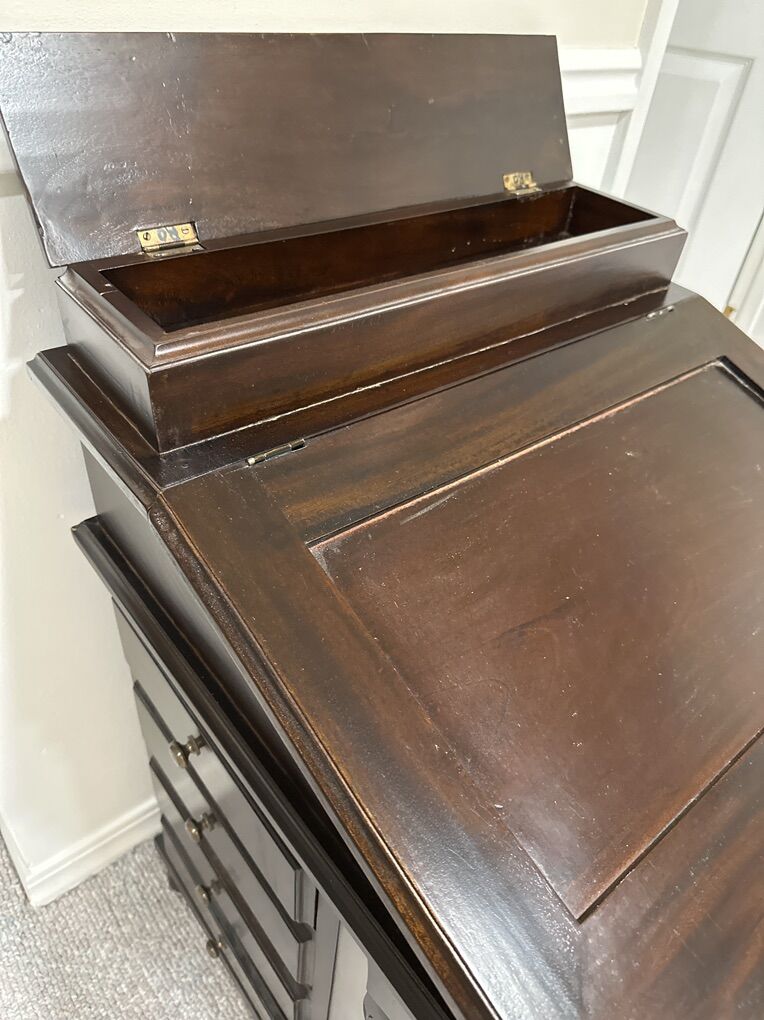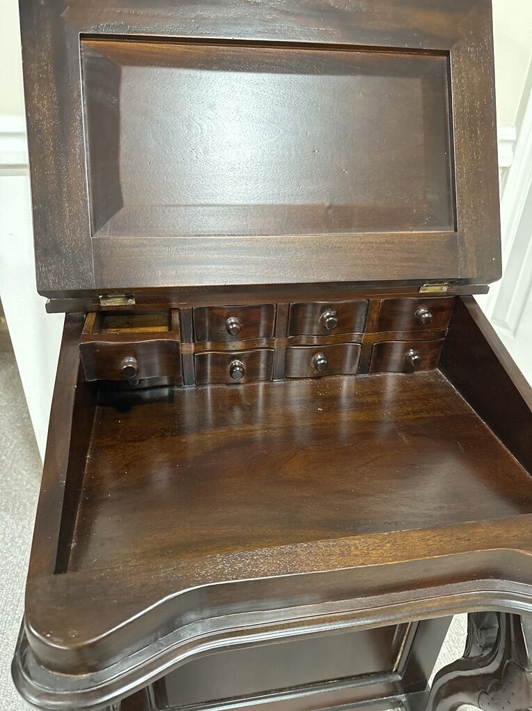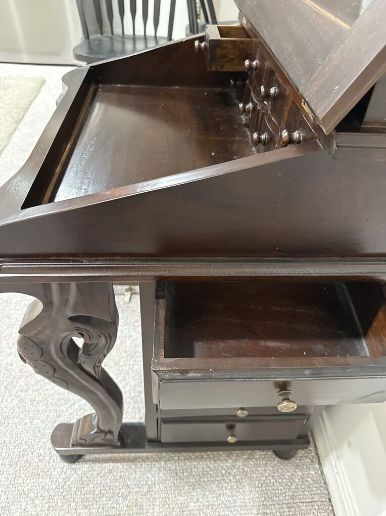 This is a Davenport-style writing desk — rich dark wood with side drawers and hinged top. Looks great in a home office, bedroom, or living space. • Solid wood construction • Hinged top with internal storage drawers • Classic lines and carved legs • Good condition — functional and sturdy • Note: Original writing pad / leather insert is missing This piece is a reproduction style desk — not a true Victorian antique, but still a stylish and useful furniture piece. Dimensions (approximate): • Height: 32 1/2” • Width: 21” • Depth: 21”